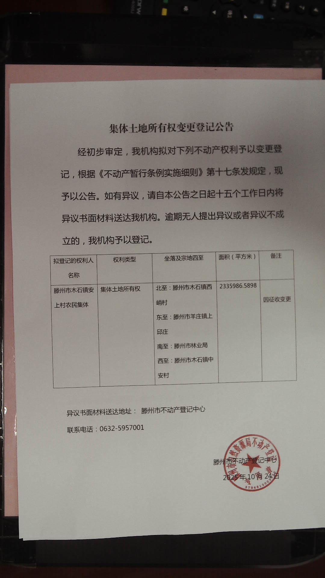 滕州市自然资源局集体土地所有权变更登记公告