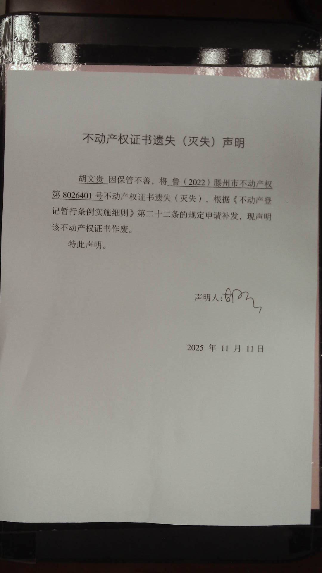 滕州市自然资源局不动产权证书遗失(灭失)声明
