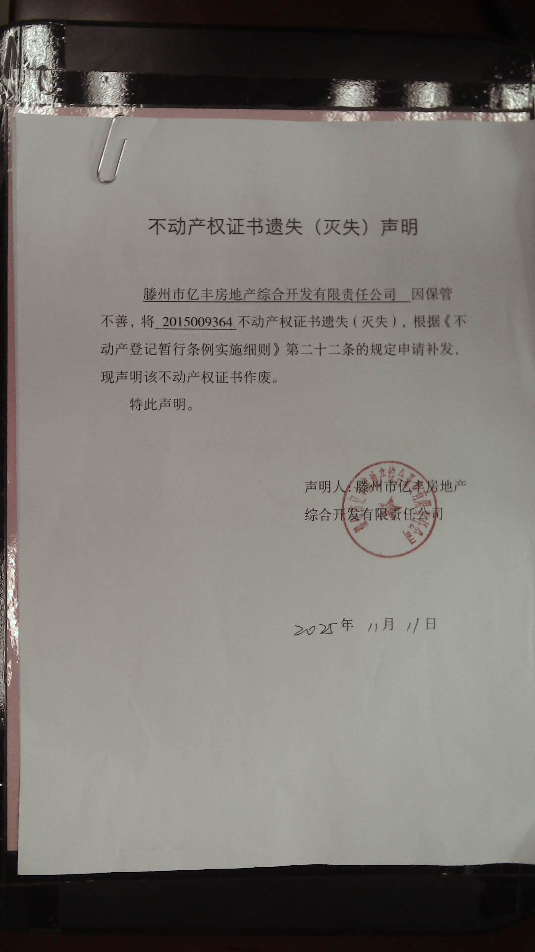 滕州市自然资源局不动产权证书遗失(灭失)声明