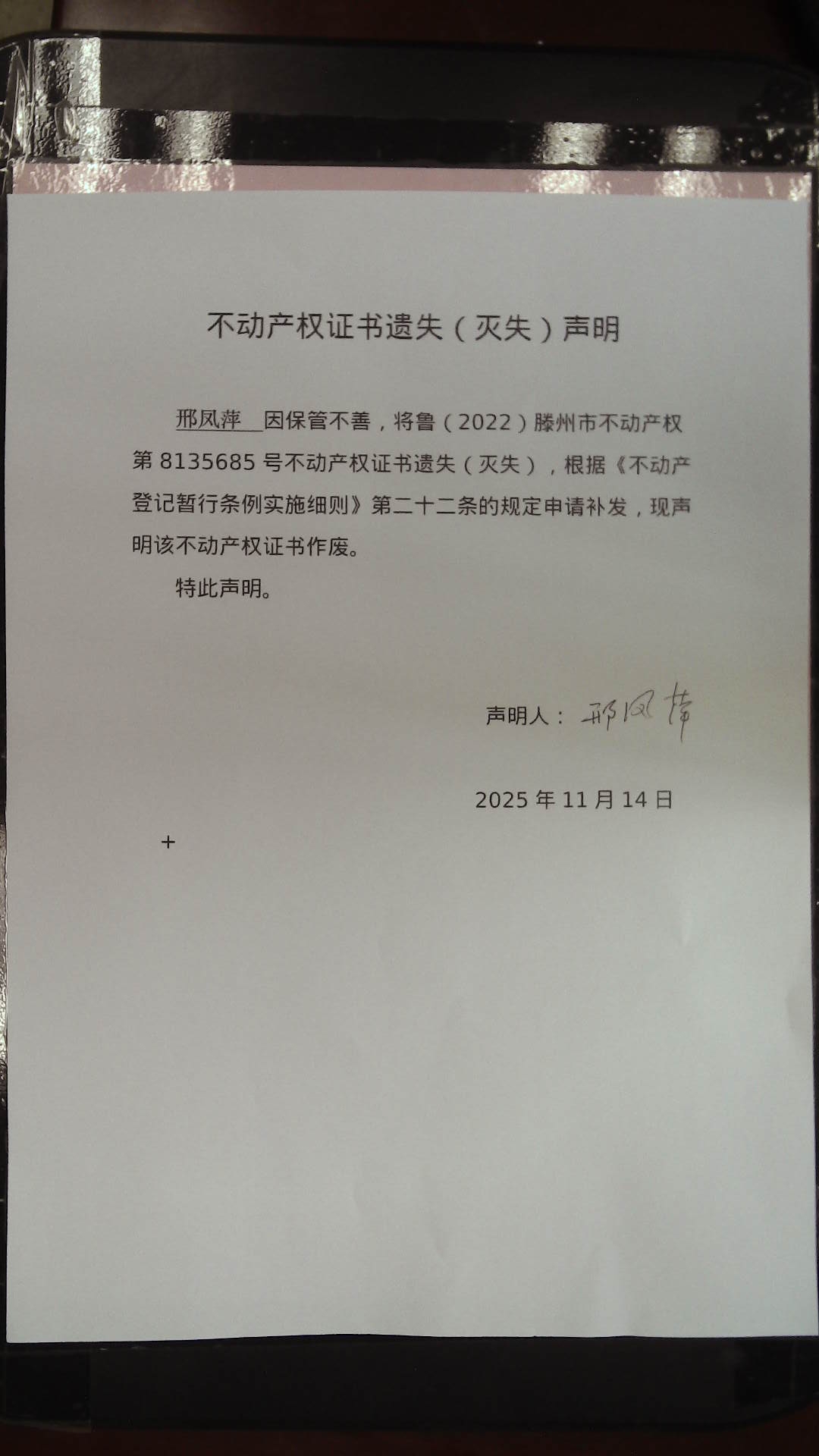 滕州市自然资源局不动产权证书遗失(灭失)声明