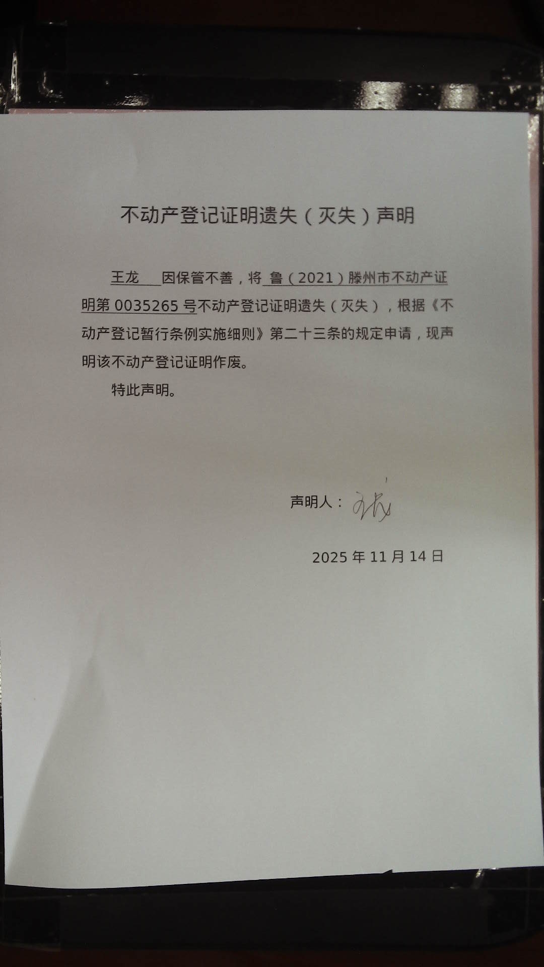 滕州市自然资源局不动产登记证明遗失(灭失)声明