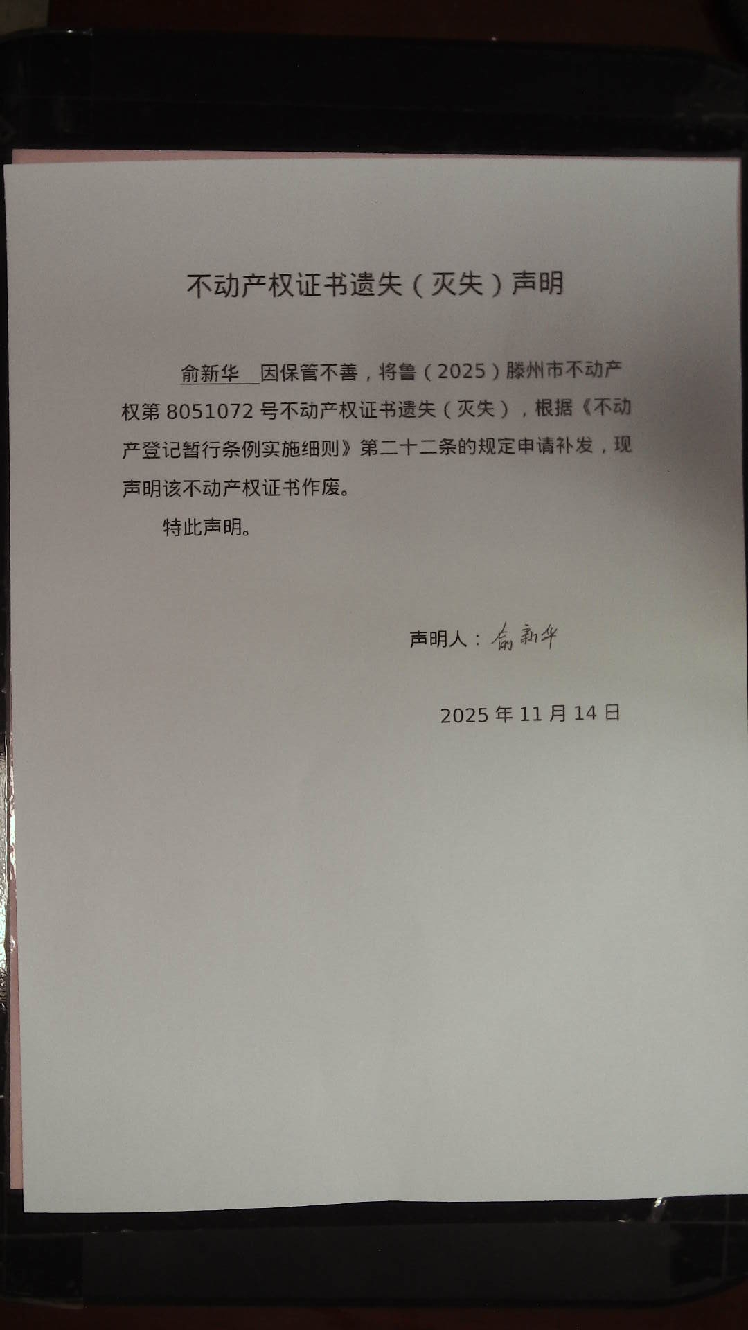 滕州市自然资源局不动产权证书遗失(灭失)声明