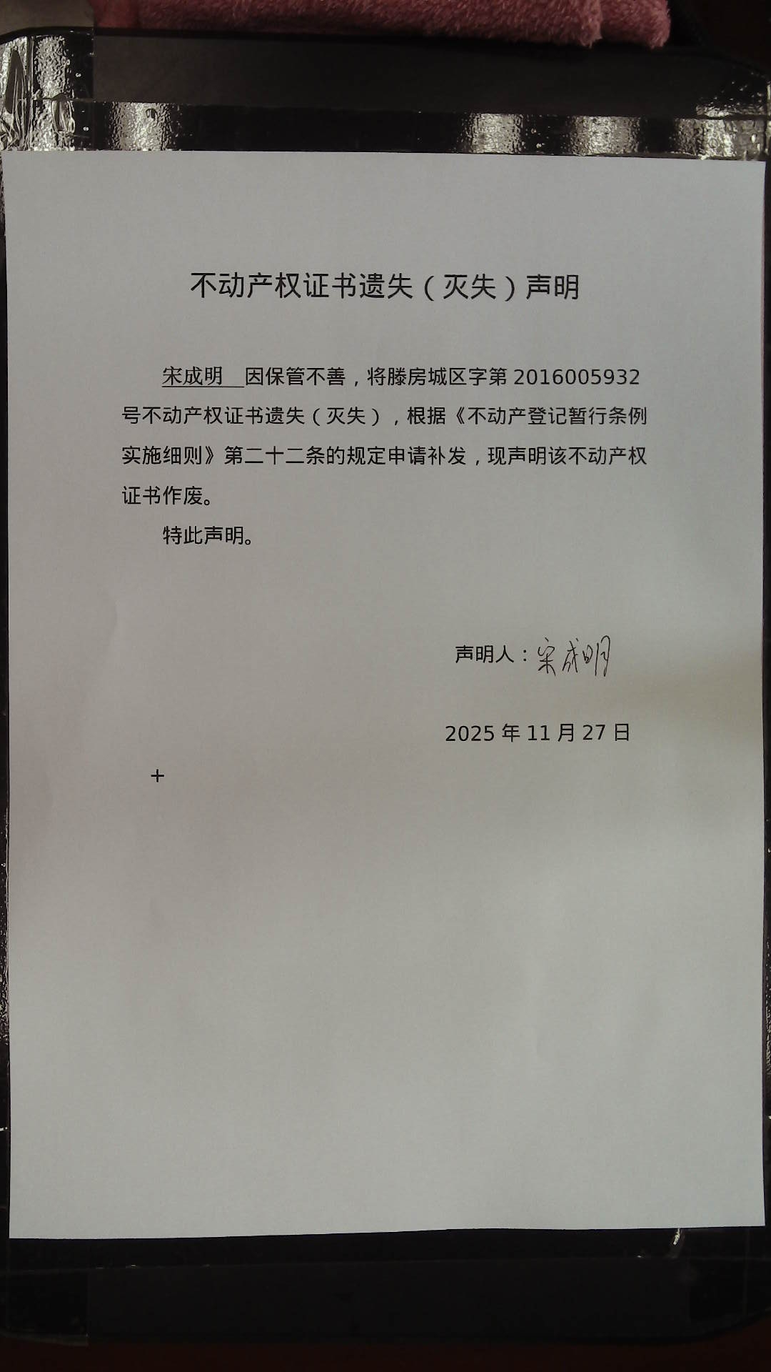 滕州市自然资源局不动产权证书遗失(灭失)声明