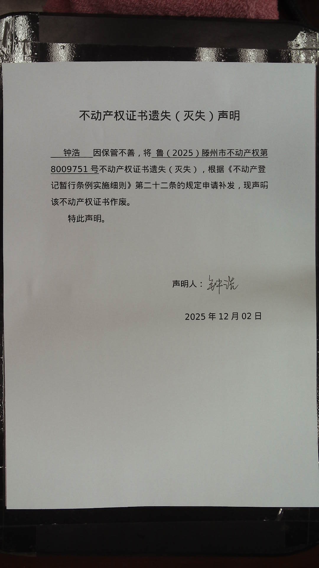 滕州市自然资源局房屋所有权证书遗失(灭失)声明