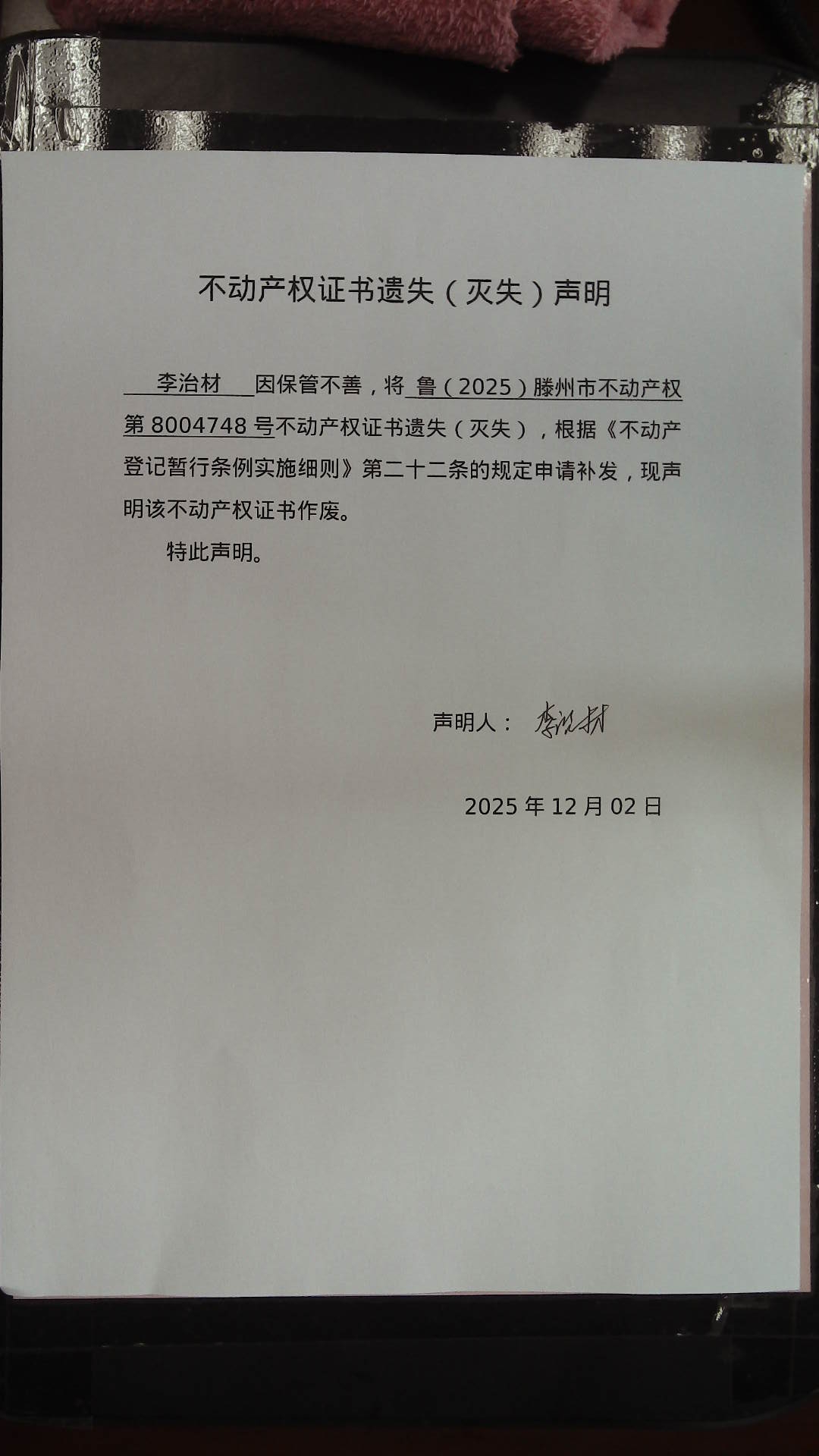 滕州市自然资源局房屋所有权证书遗失(灭失)声明