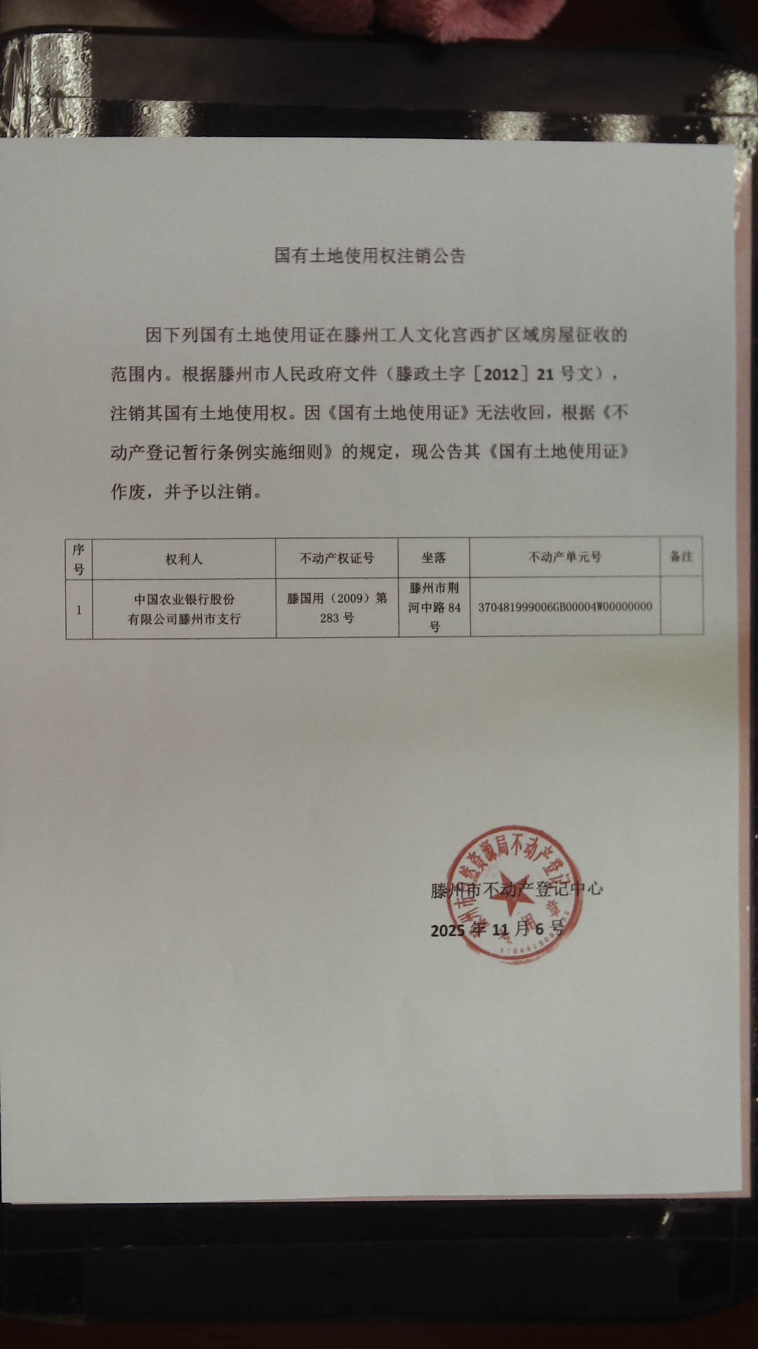 滕州市自然资源局国有土地所有权注销公告