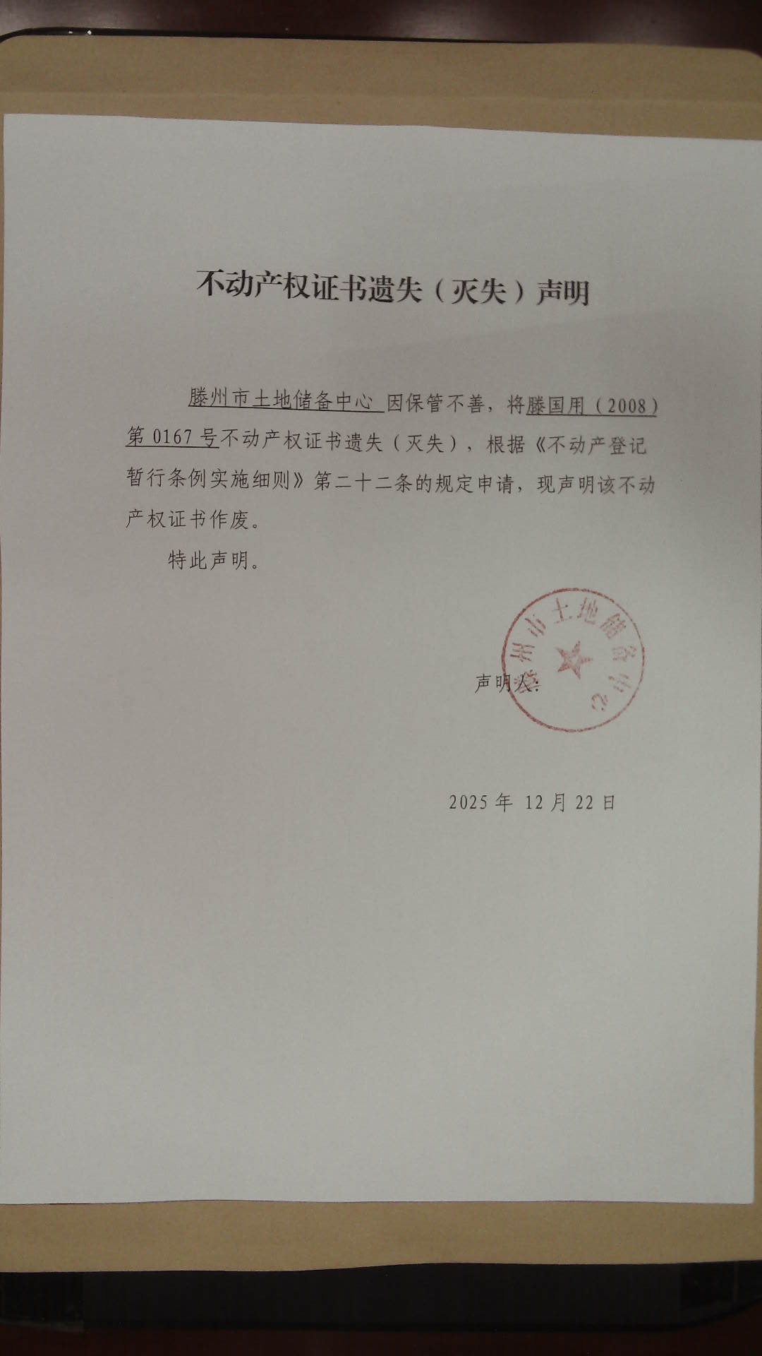 滕州市自然资源局不动产权证书遗失(灭失)声明
