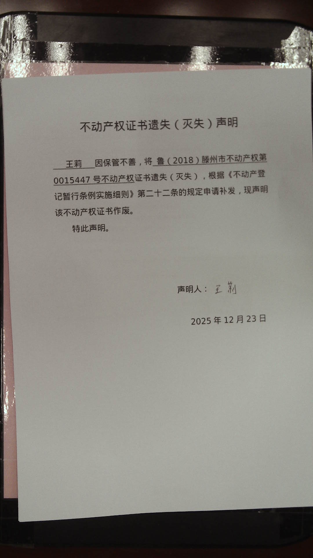 滕州市自然资源局不动产权证书遗失(灭失)声明