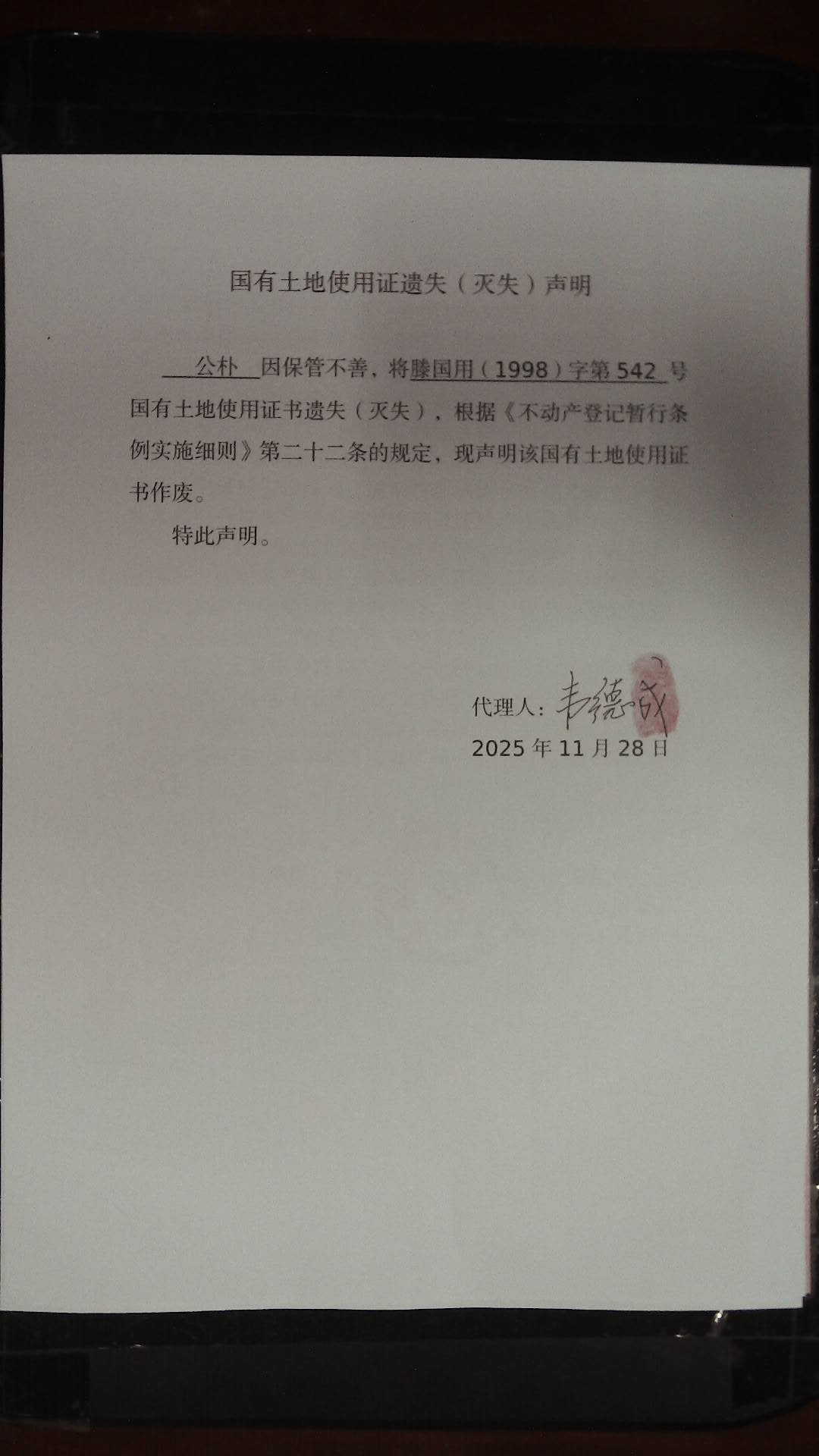 滕州市自然资源局国有土地使用证(遗失)灭失声明