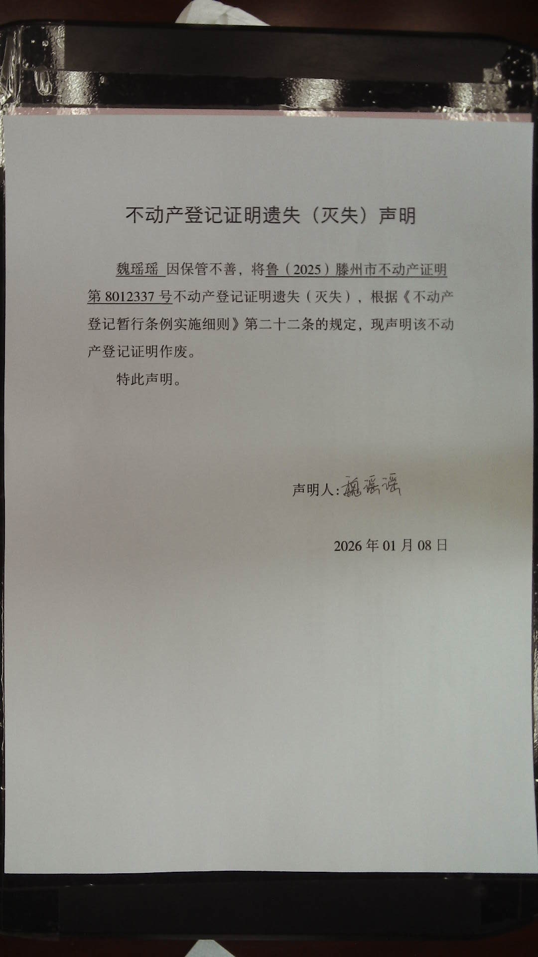 滕州市自然资源局不动产登记证明遗失(灭失)声明