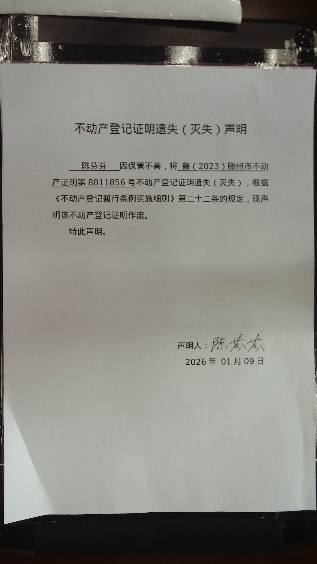滕州市自然资源局不动产登记证明遗失(灭失)声明