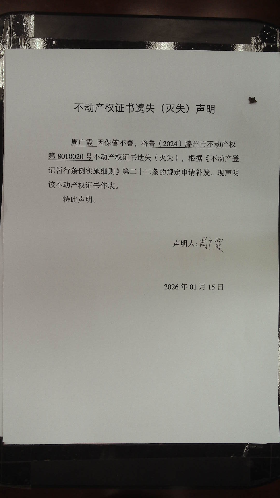 滕州市自然资源局不动产权证书遗失(灭失)声明