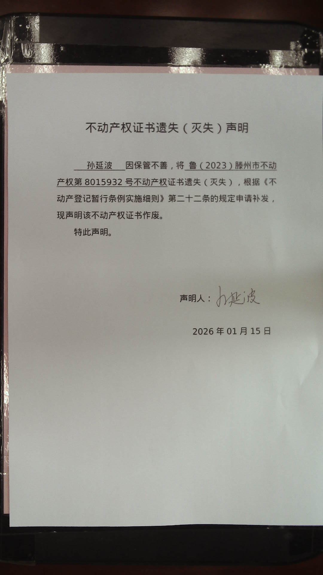 滕州市自然资源局不动产权证书遗失(灭失)声明