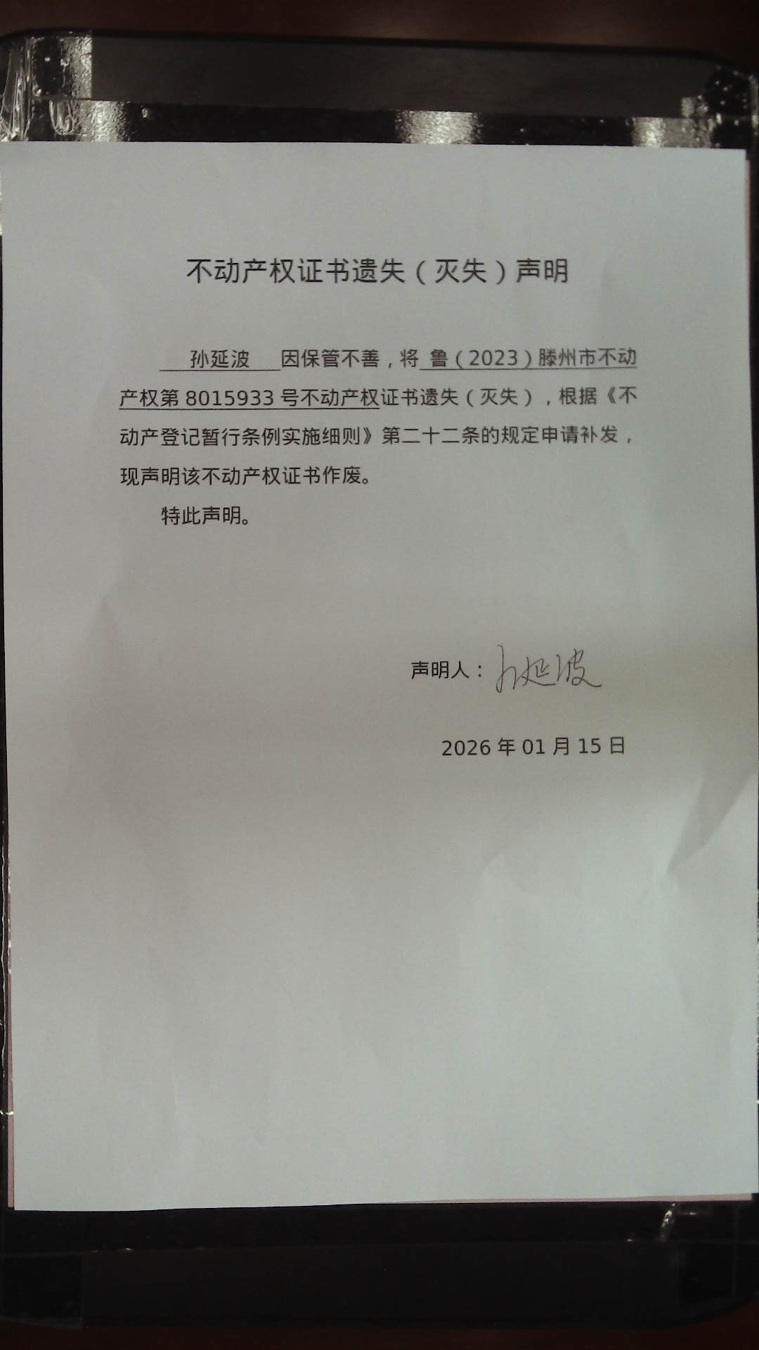 滕州市自然资源局不动产权证书遗失(灭失)声明
