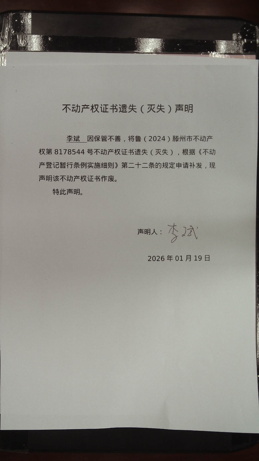 滕州市自然资源局不动产权证书遗失(灭失)声明