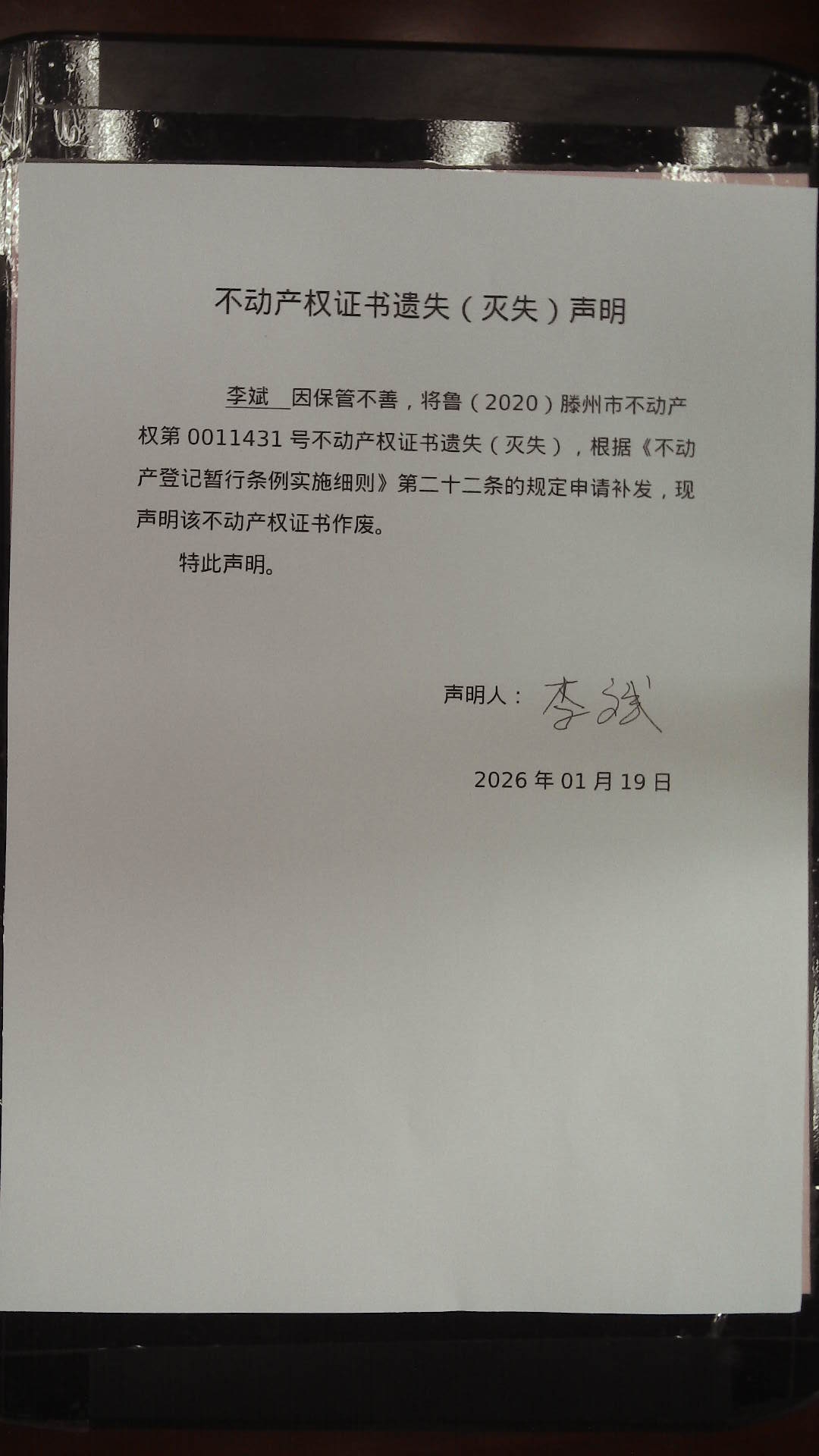 滕州市自然资源局不动产权证书遗失(灭失)声明