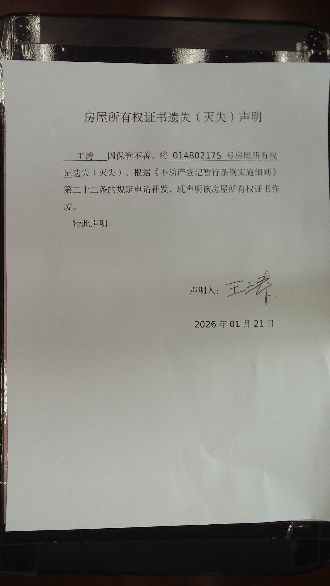 滕州市自然资源局房屋所有权证书遗失(灭失)声明