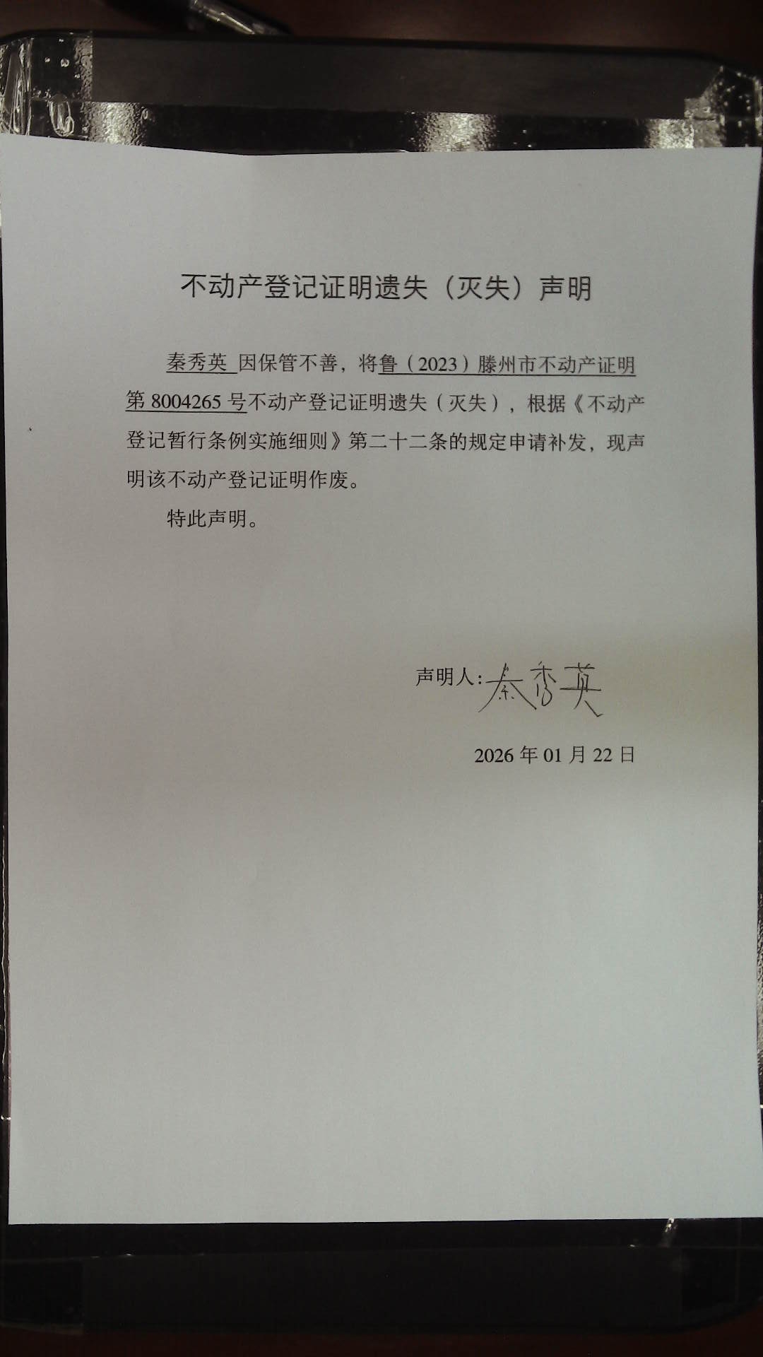 滕州市自然资源局不动产登记证明遗失(灭失)声明