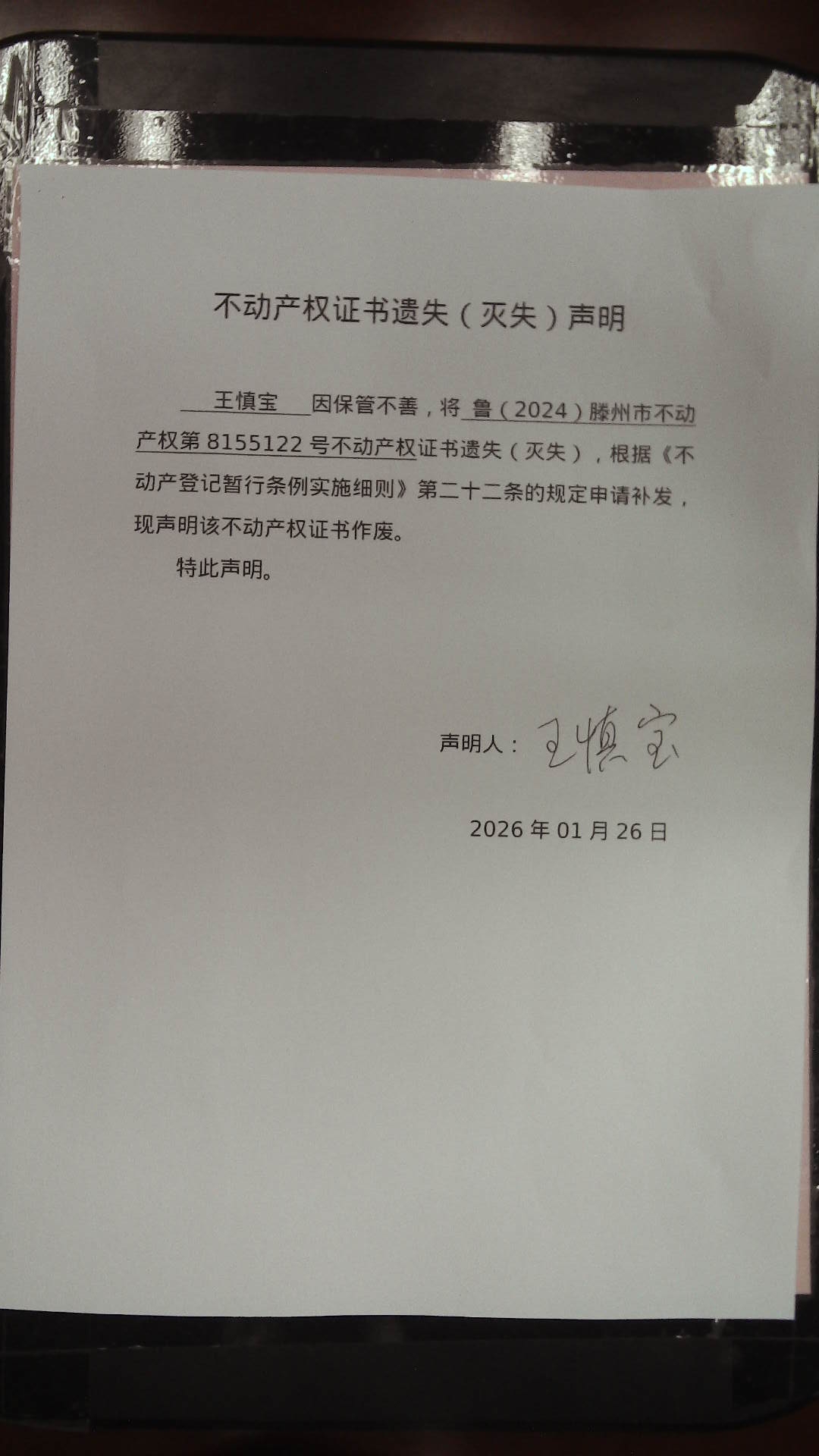 滕州市自然资源局不动产权证书遗失(灭失)声明