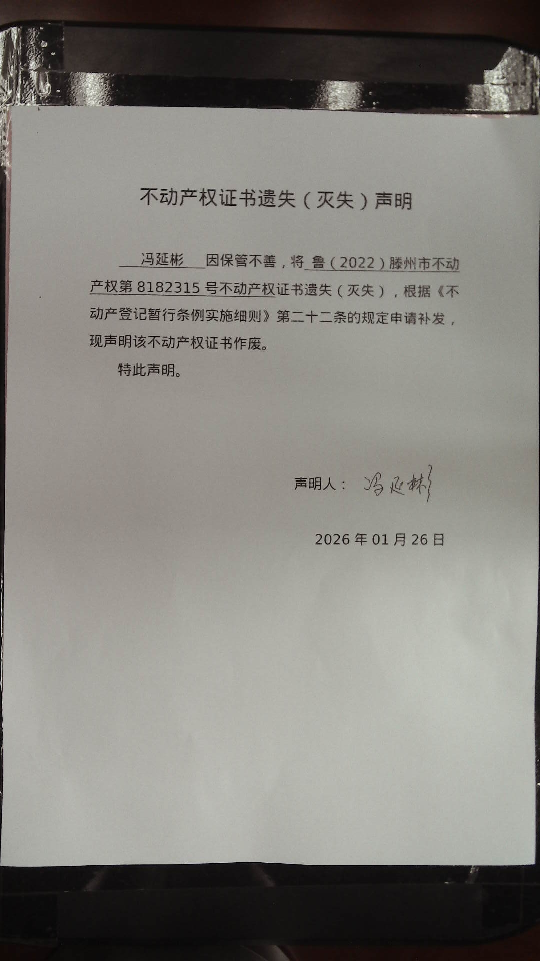 滕州市自然资源局不动产权证书遗失(灭失)声明