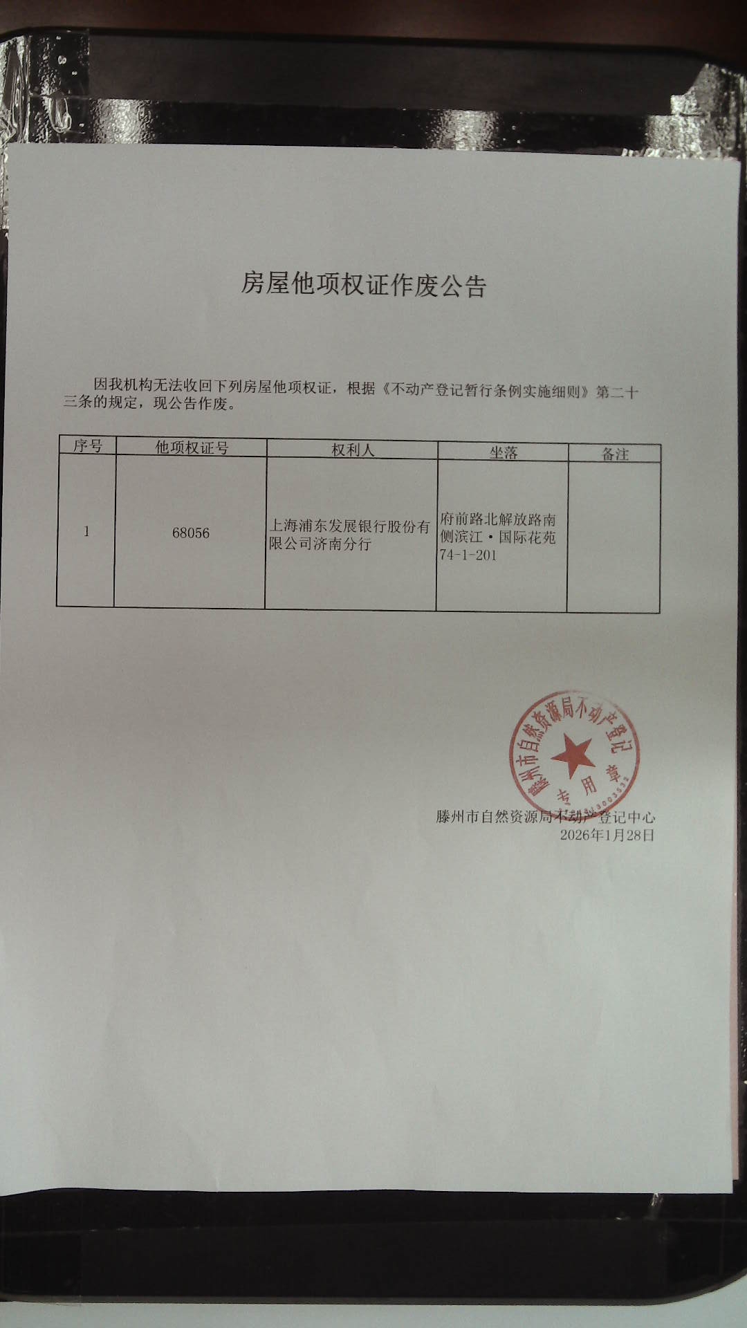滕州市自然资源局房屋他项权证作废公告