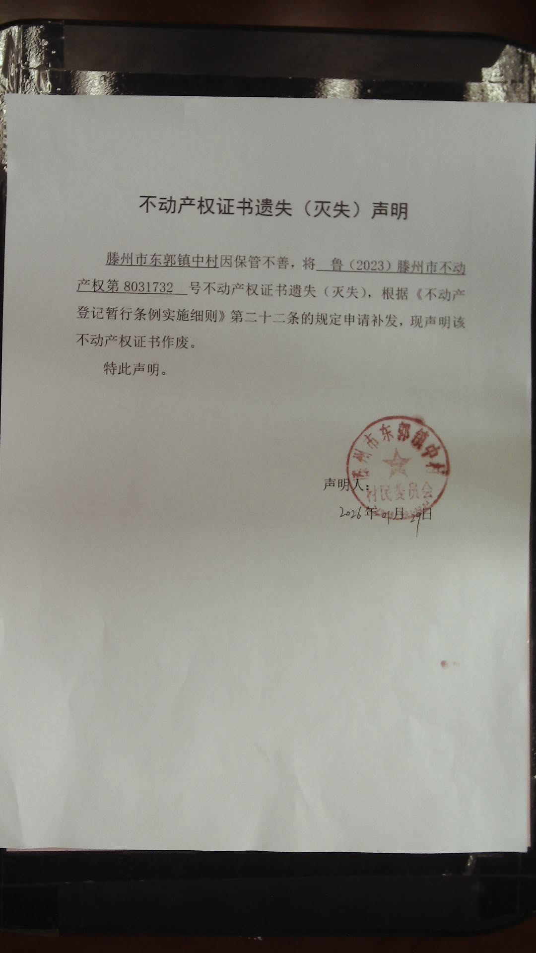 滕州市自然资源局不动产权证书遗失(灭失)声明