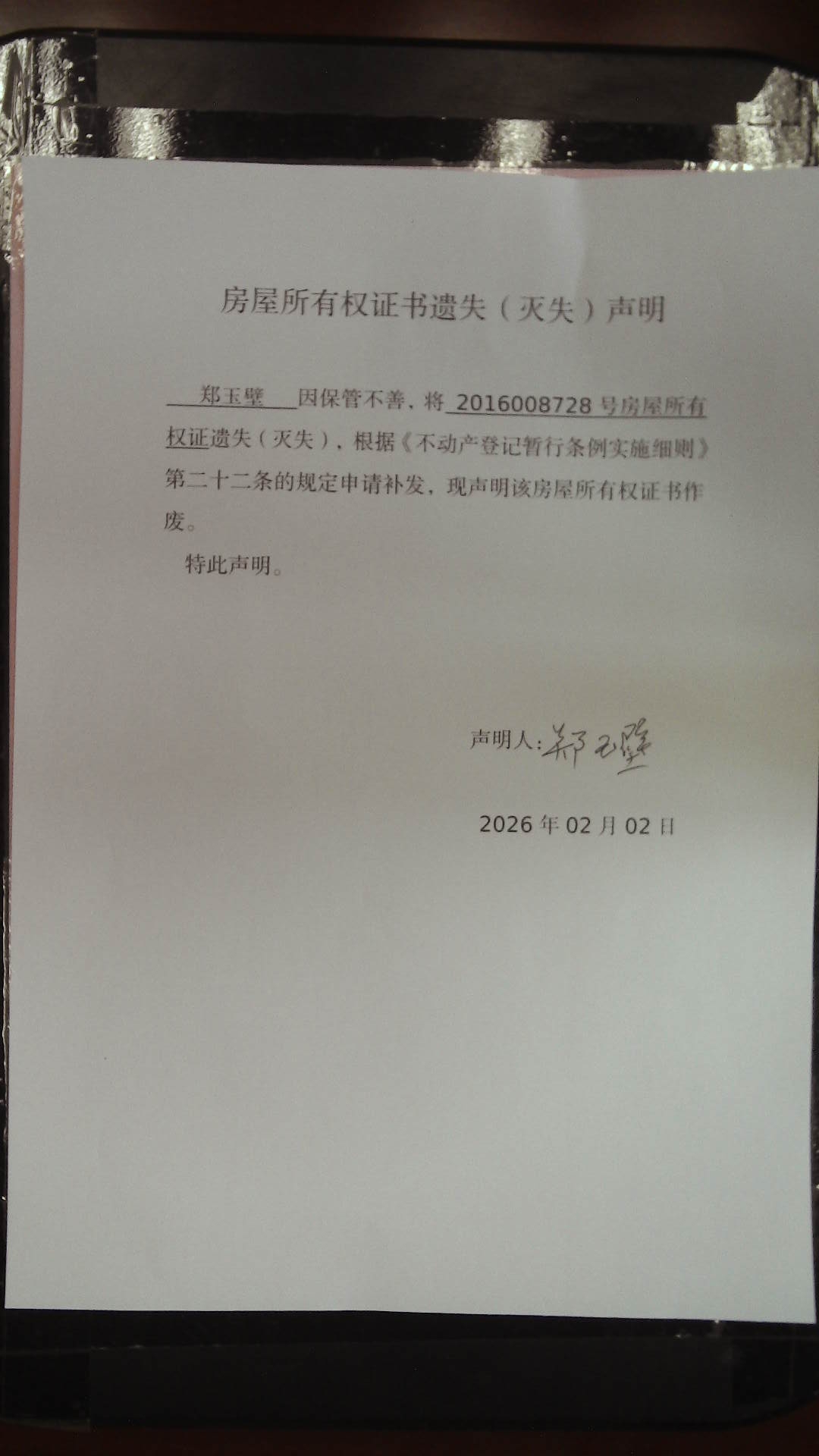 滕州市自然资源局房屋所有权证书遗失(灭失)声明