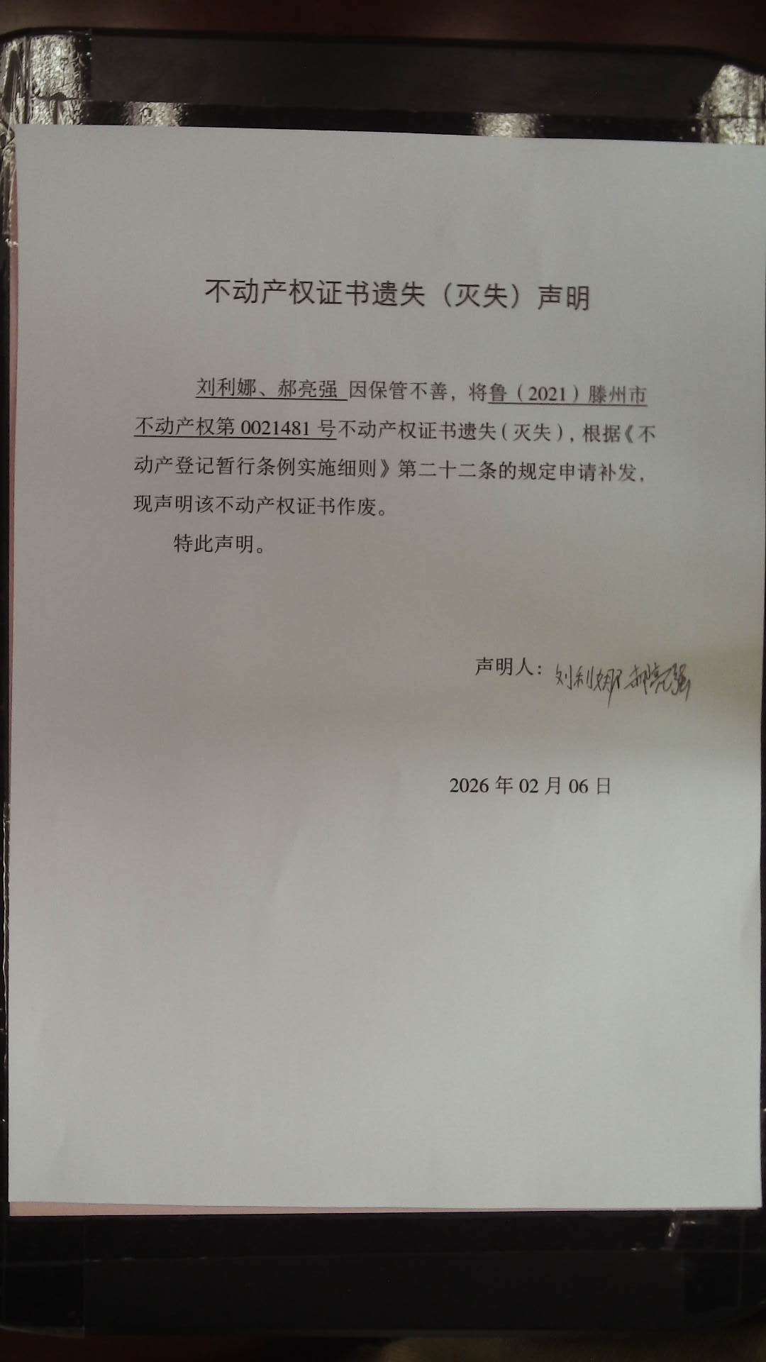 滕州市自然资源局不动产权证书遗失(灭失)声明