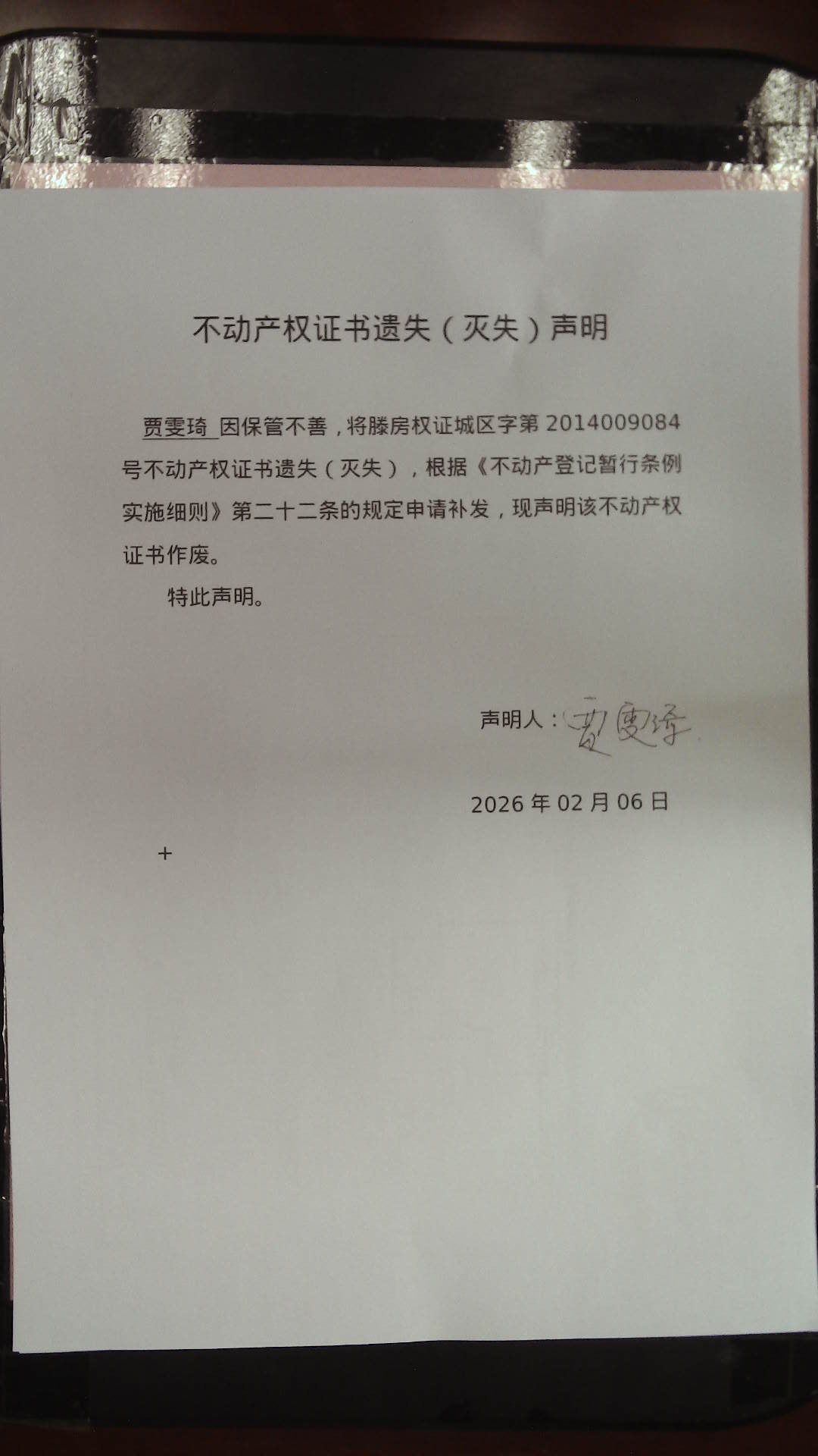 滕州市自然资源局不动产权证书遗失(灭失)声明