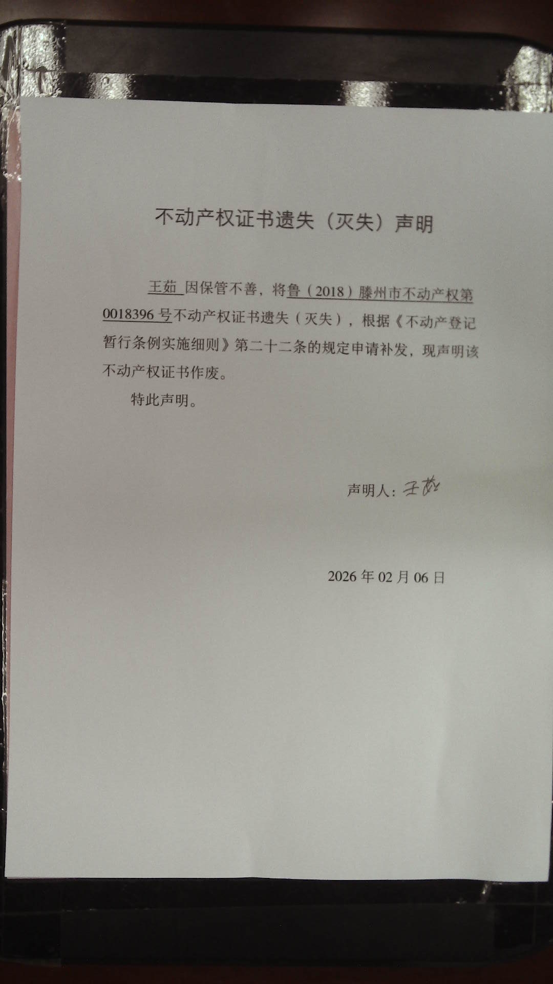 滕州市自然资源局不动产权证书遗失(灭失)声明