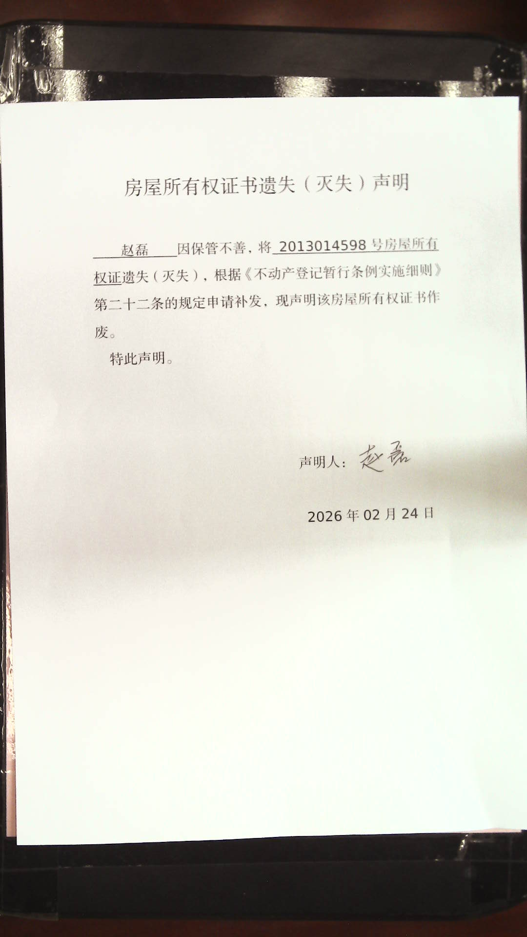 滕州市自然资源局房屋所有权权证书遗失(灭失)声明