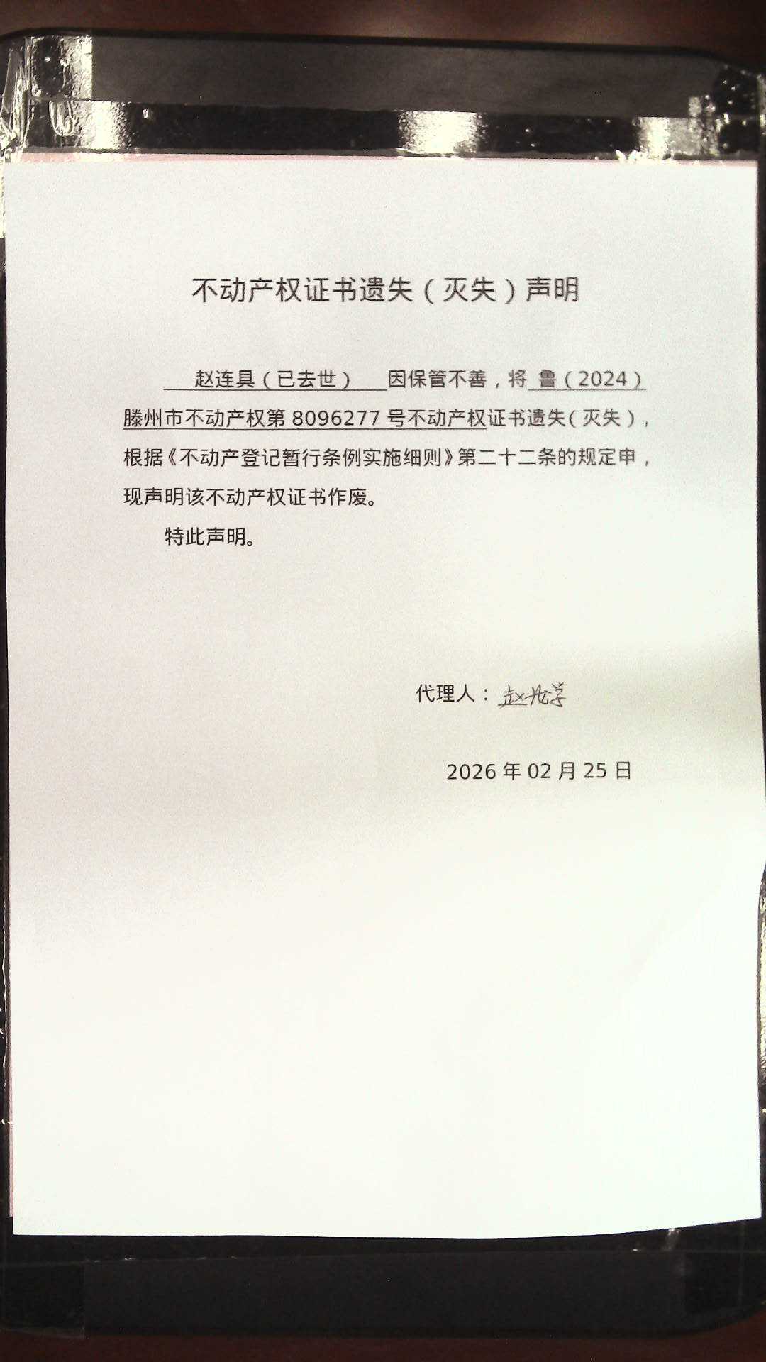 滕州市自然资源局不动产权证书遗失(灭失)声明