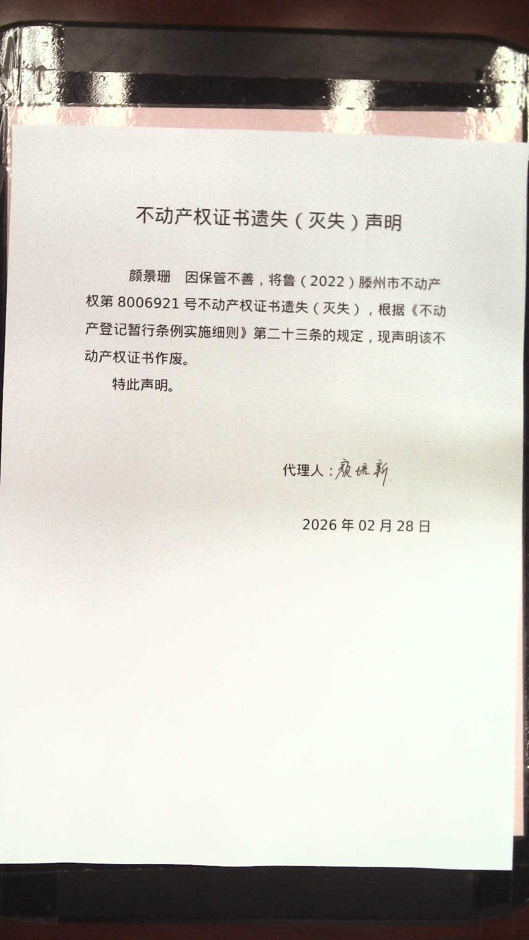 滕州市自然资源局不动产权证书遗失(灭失)声明