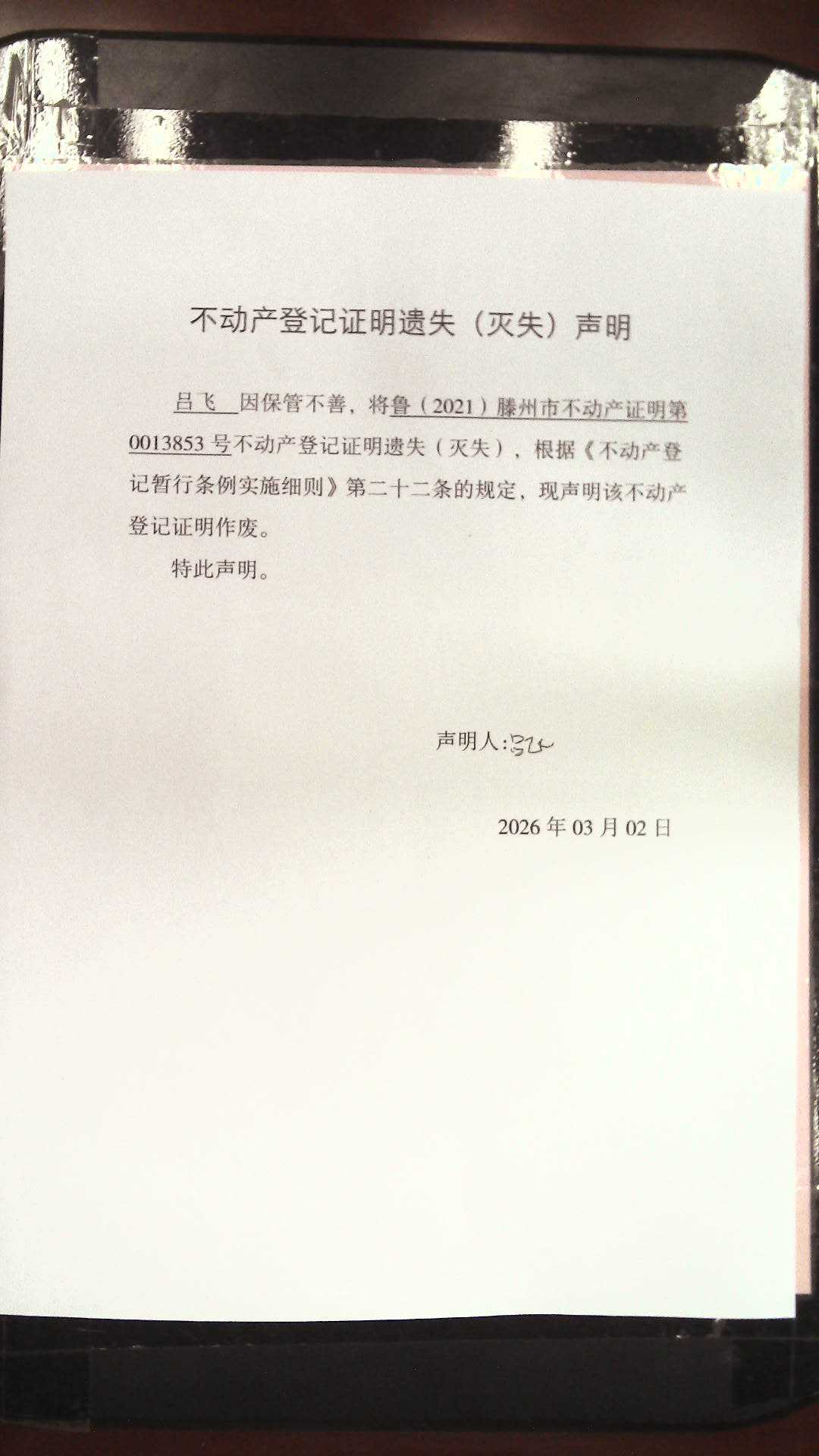 滕州市自然资源局不动产登记证明遗失(灭失)声明