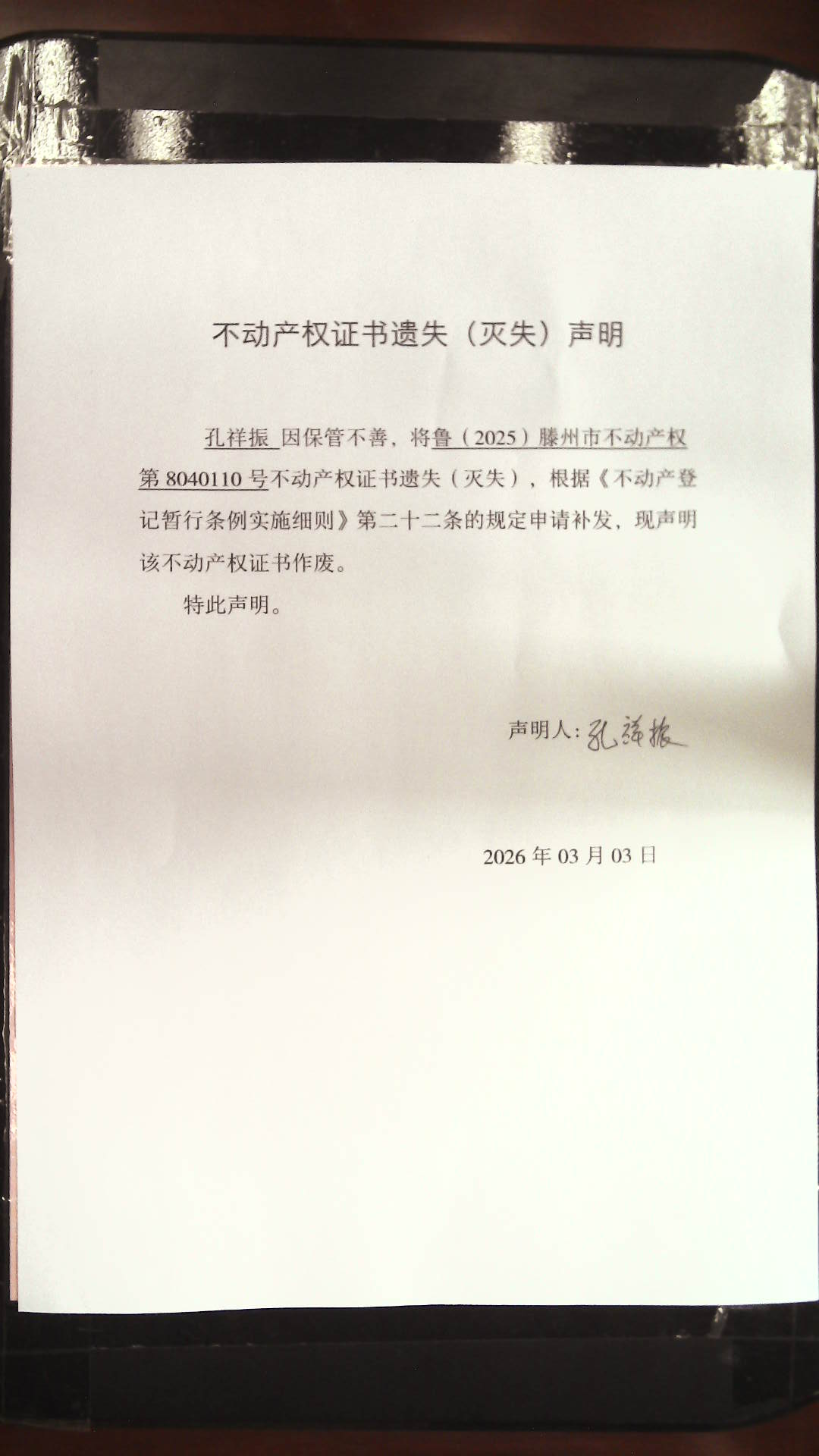 滕州市自然资源局不动产权证书遗失(灭失)声明