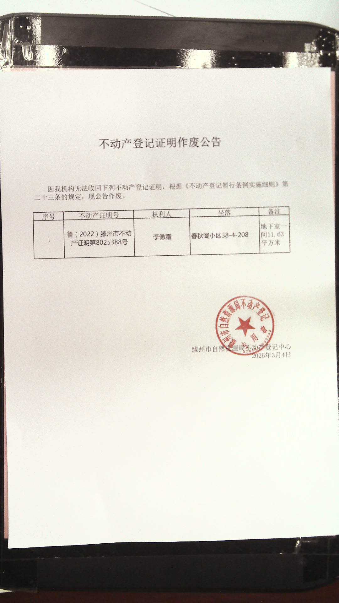 滕州市自然资源局不动产登记证明作废公告