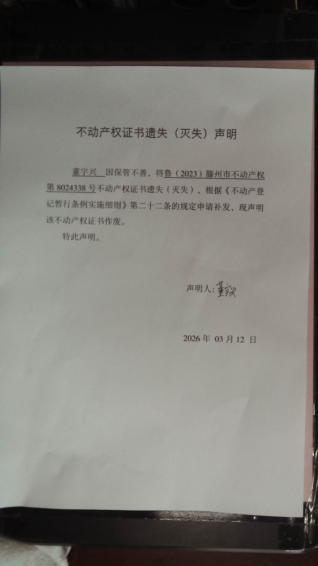 滕州市自然资源局不动产权证书遗失(灭失)声明