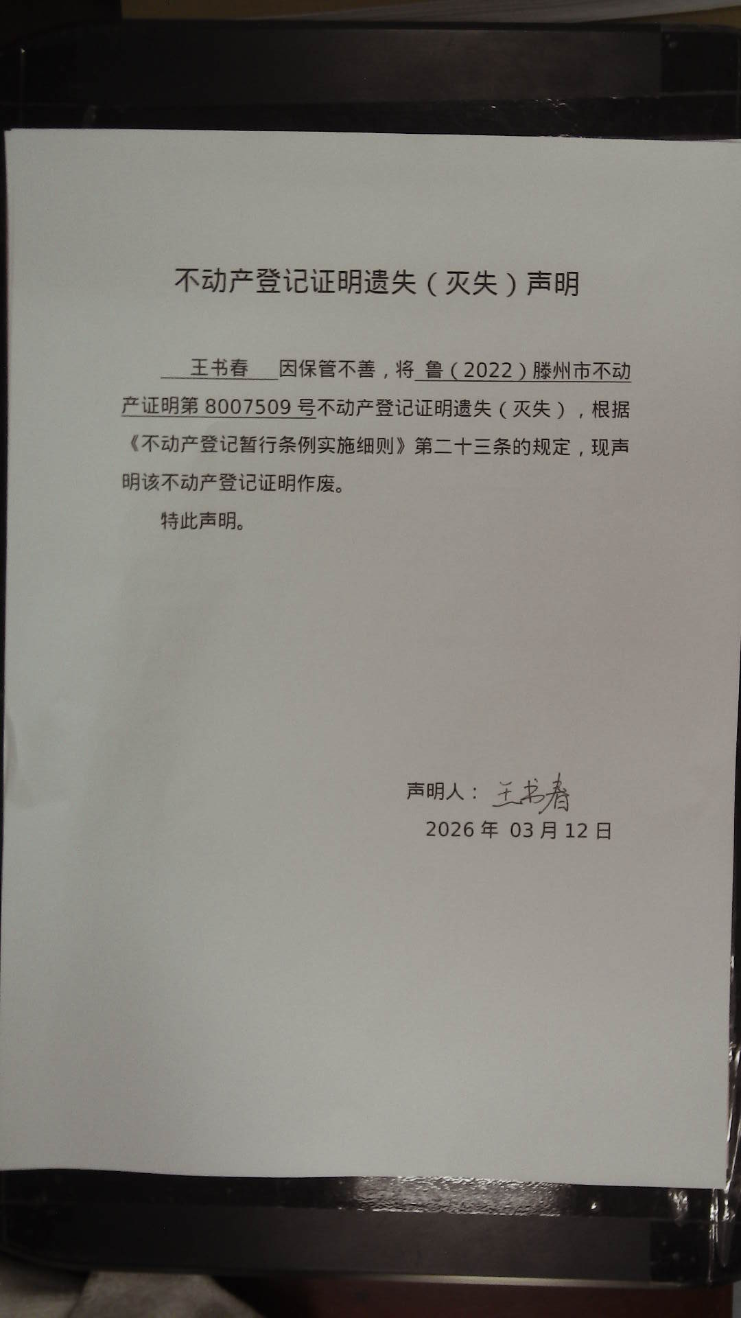 滕州市自然资源局不动产登记证明遗失(灭失)声明