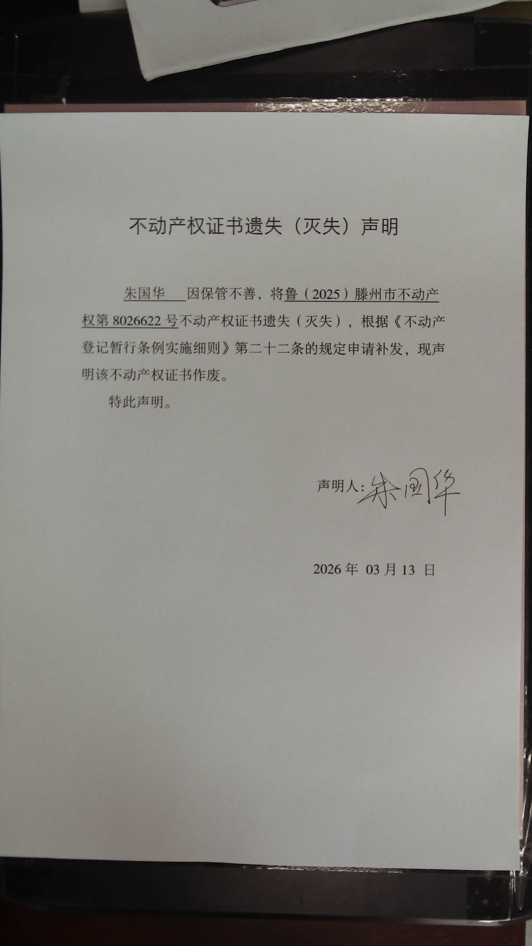 滕州市自然资源局不动产权证书遗失(灭失)声明