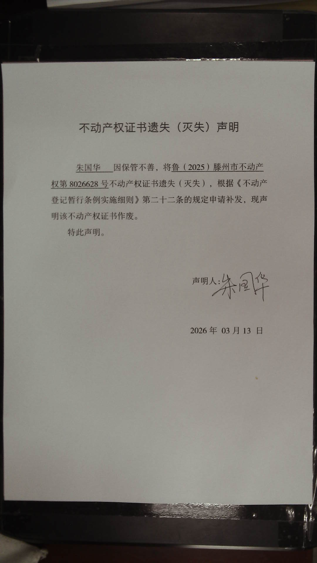滕州市自然资源局不动产权证书遗失(灭失)声明
