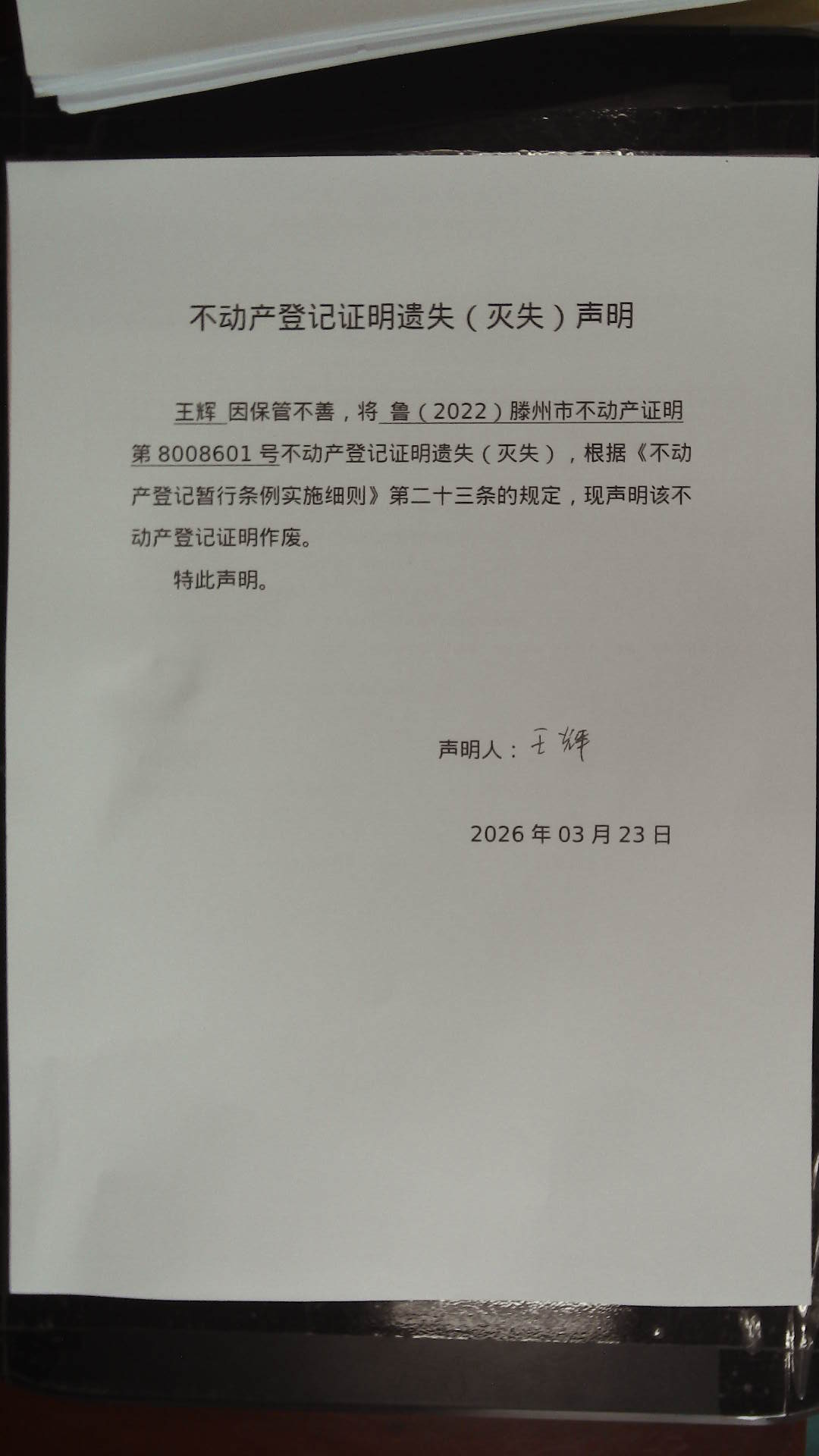 滕州市自然资源局不动产登记证明遗失(灭失)声明