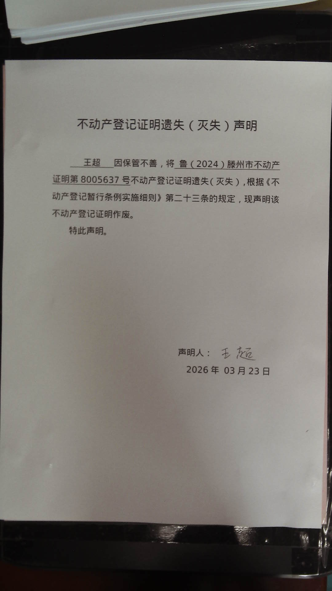 滕州市自然资源局不动产登记证明遗失(灭失)声明