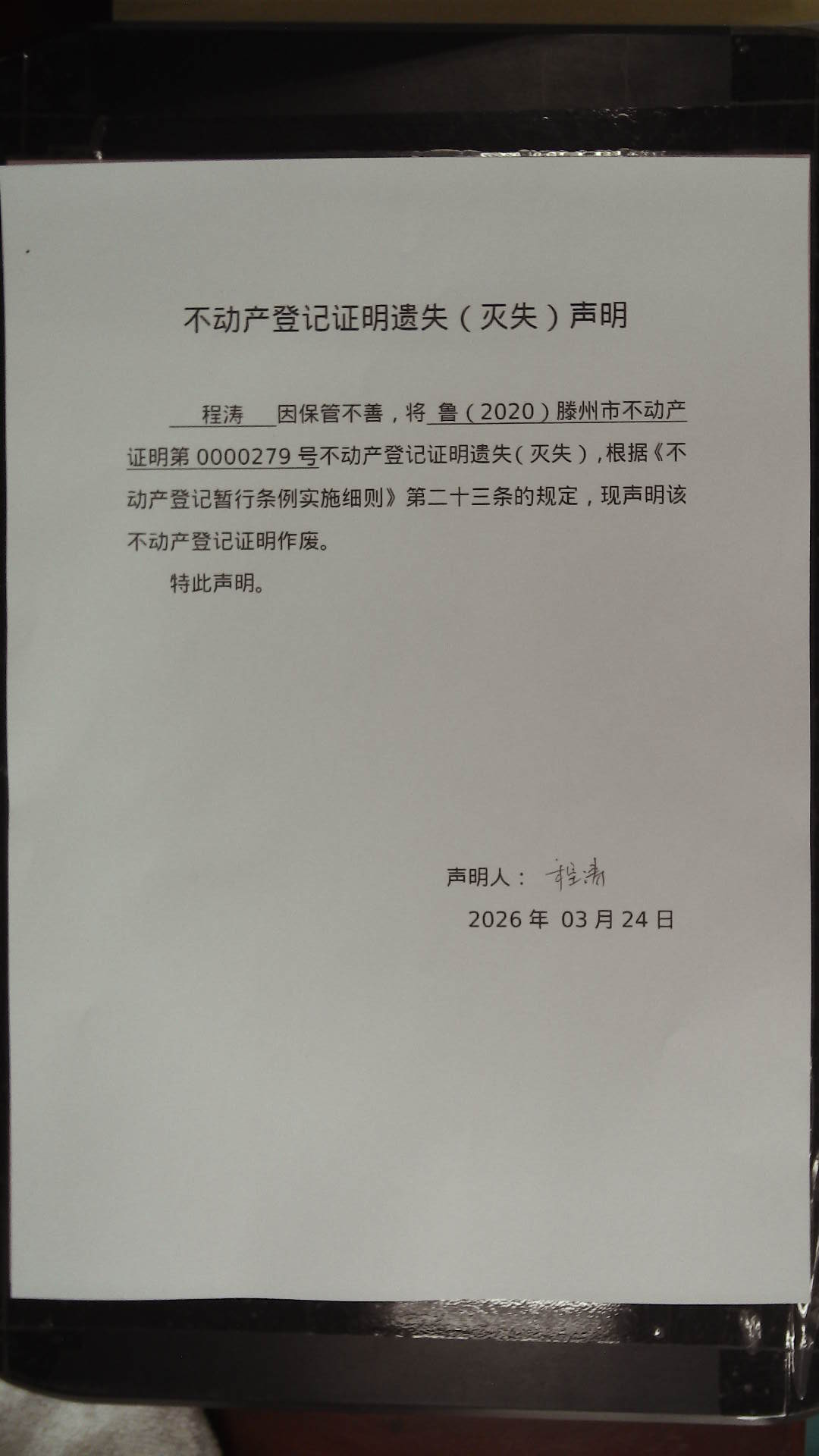 滕州市自然资源局不动产登记证明遗失(灭失)声明
