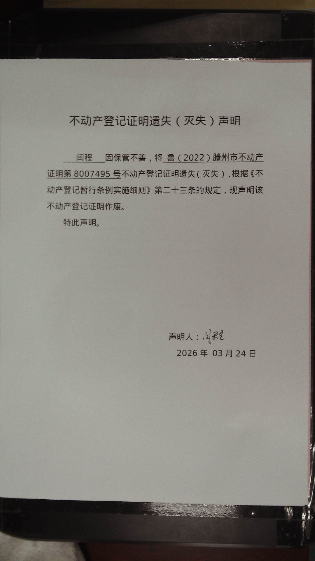 滕州市自然资源局不动产登记证明遗失(灭失)声明