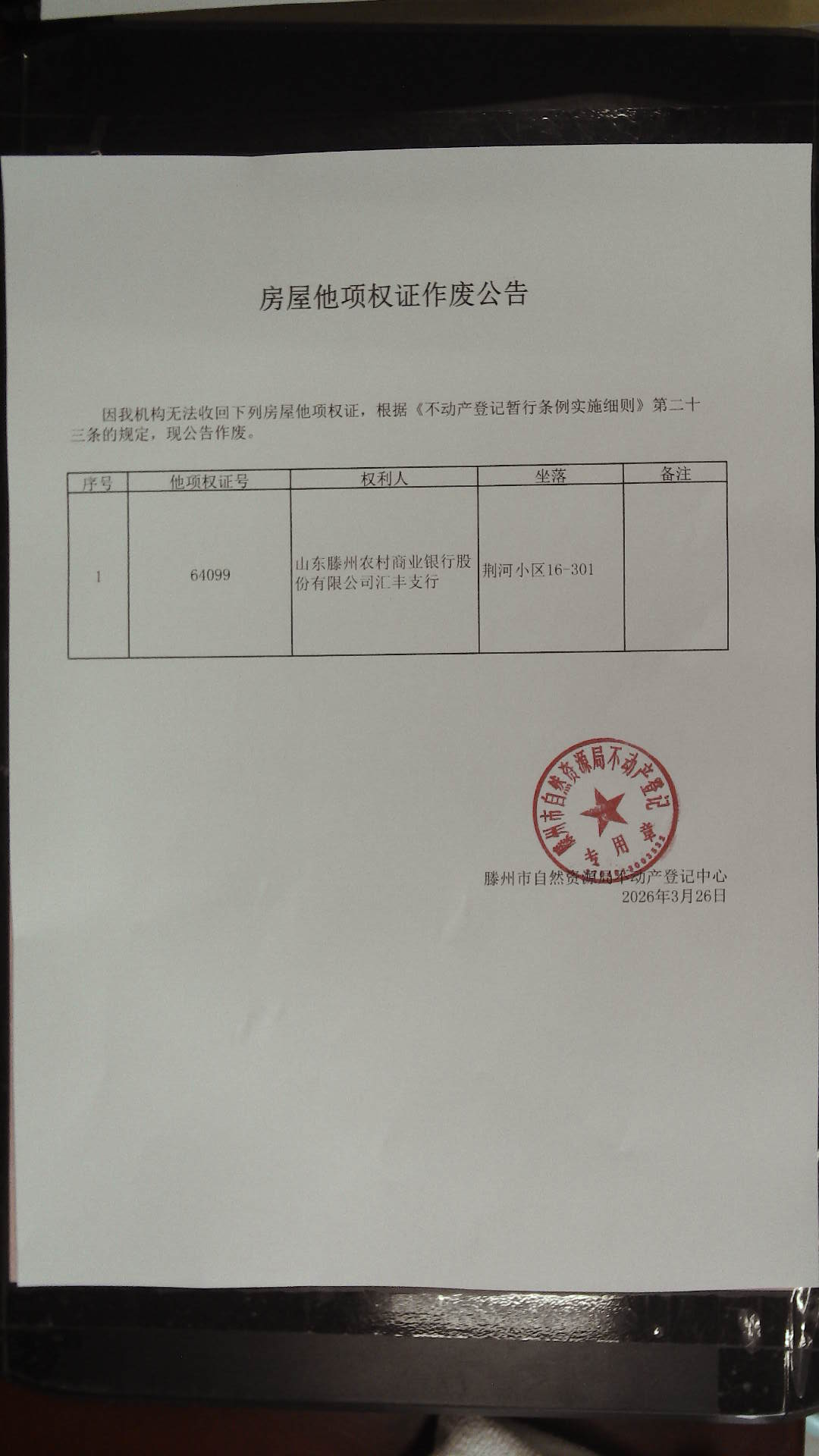 滕州市自然资源局房屋他向权证作废公告