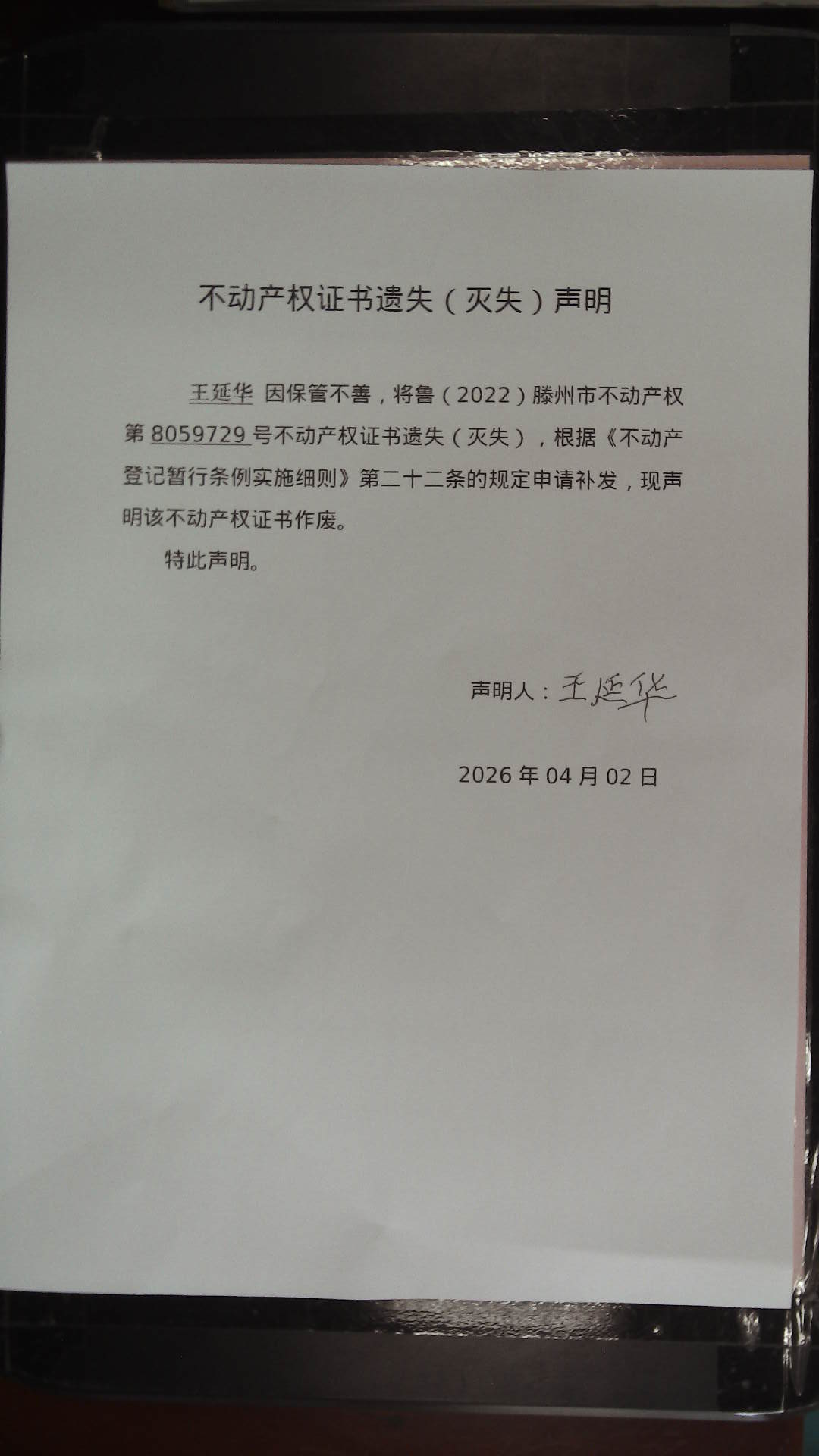 滕州市自然资源局不动产权证书遗失(灭失)声明
