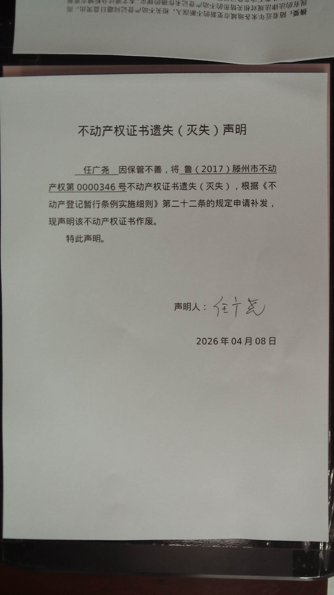 滕州市自然资源局不动产权证书遗失(灭失)声明