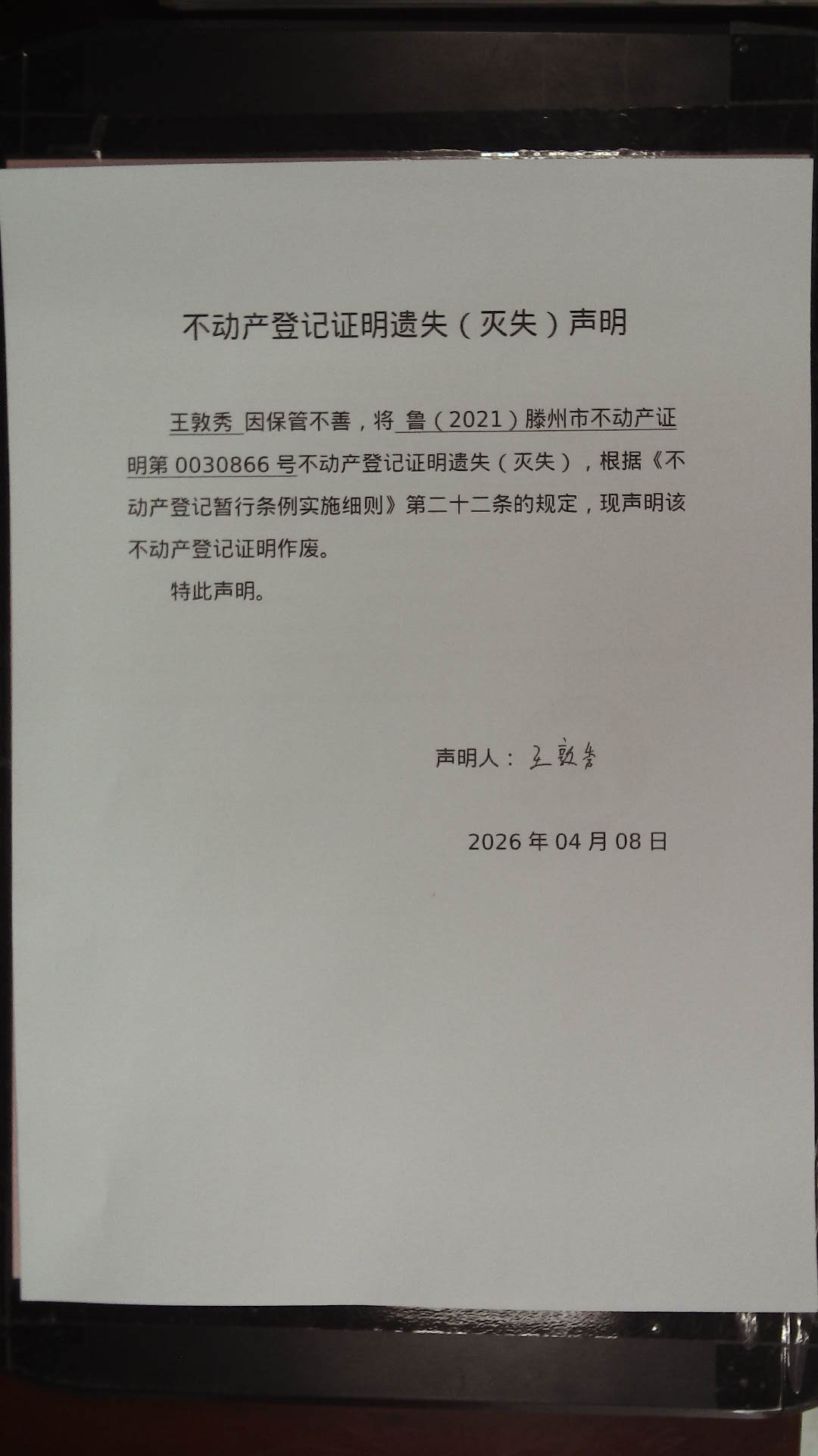 滕州市自然资源局不动产登记证明遗失(灭失)声明