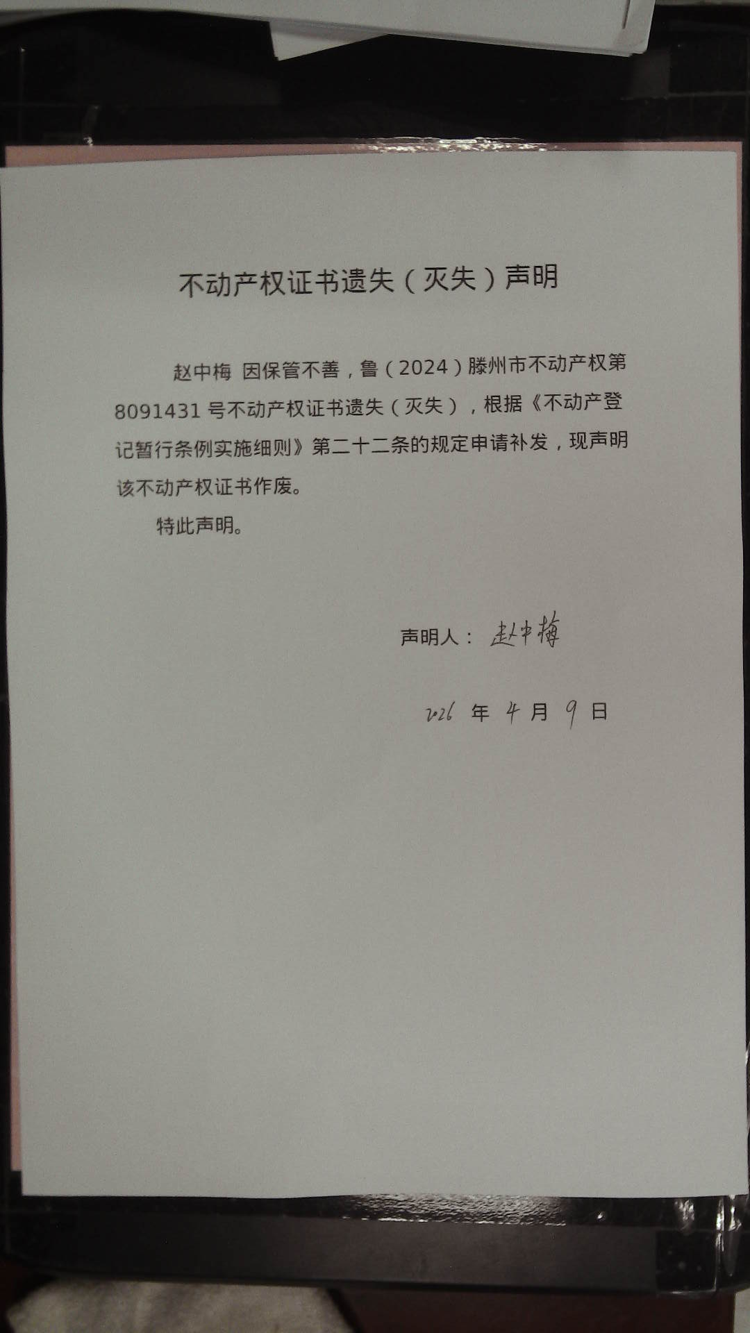 滕州市自然资源局不动产权证书遗失(灭失)声明