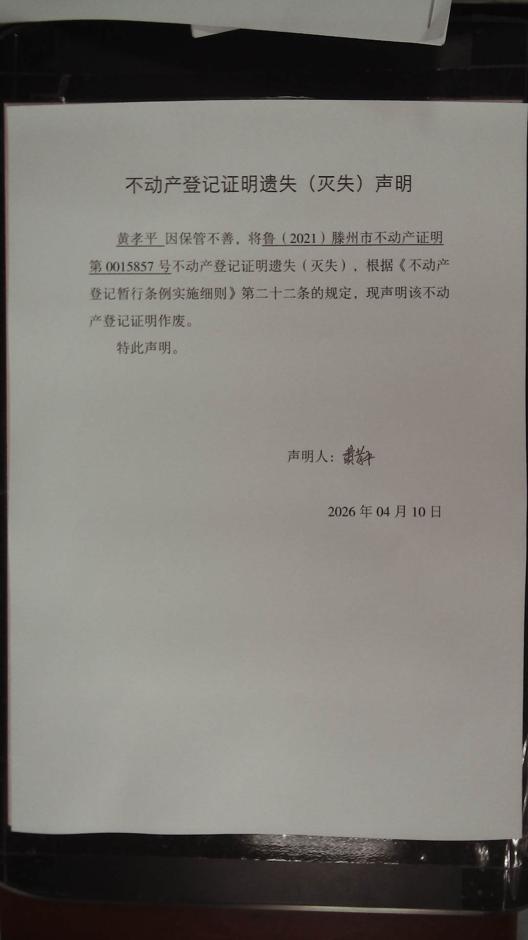 滕州市自然资源局不动产权证书遗失(灭失)声明